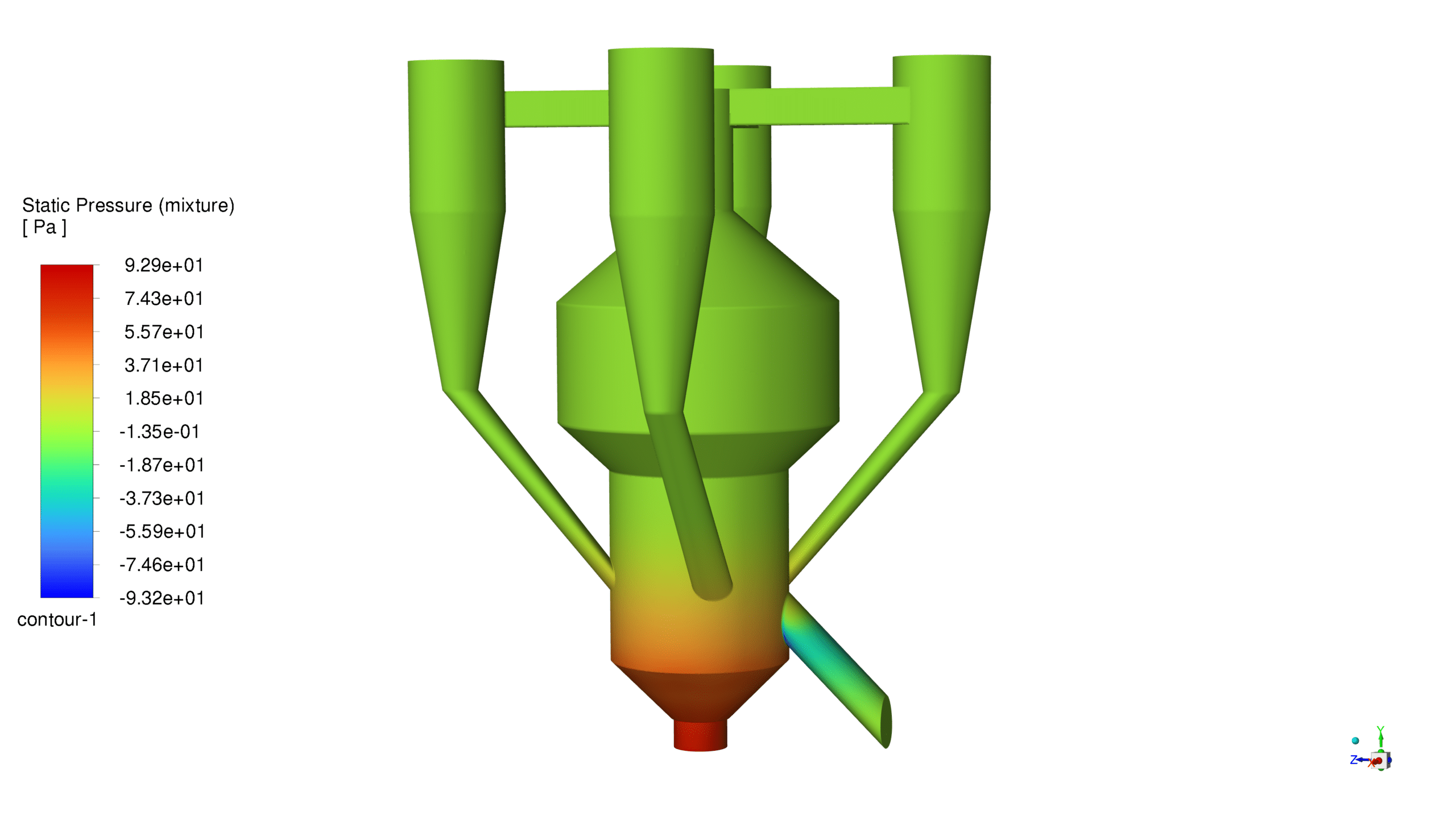 The static pressure varies between -93.2 Pa and 92.9 Pa across the reactor volume. This pressure gradient creates favorable conditions for particle suspension and ensures proper fluid dynamics within the system. The pressure distribution pattern supports the upward movement of catalyst particles and maintains stable operation.