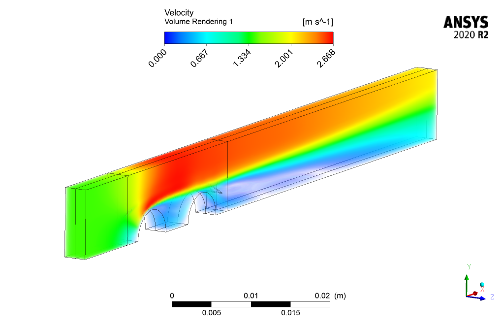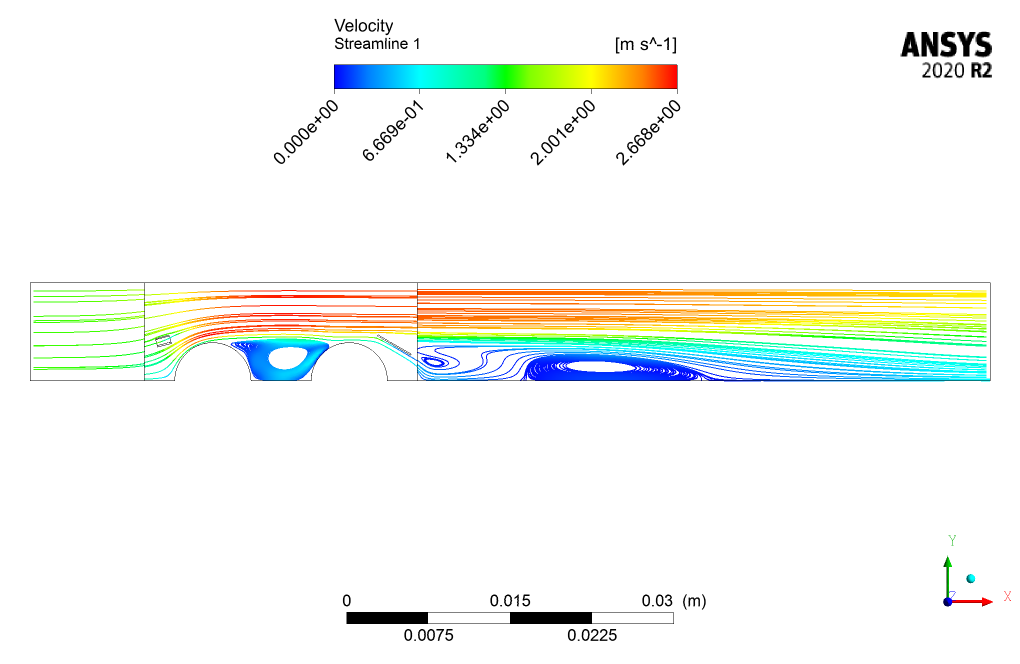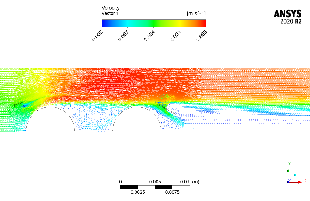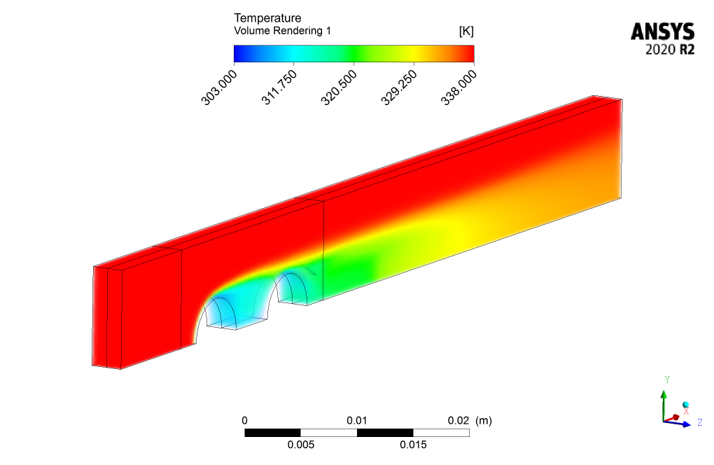 The fluid flow enters the domain with a velocity of 1.42 m/s and a temperature of 338K. This hot flow then collides with the two cold tubes with a temperature of 303K placed in the middle of the domain and loses their temperature.