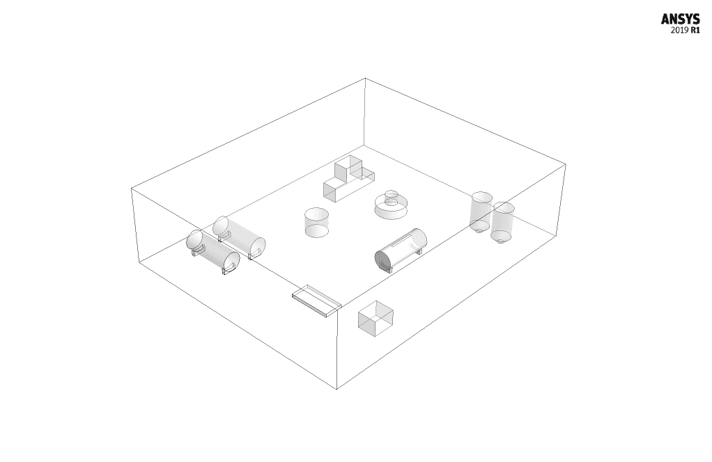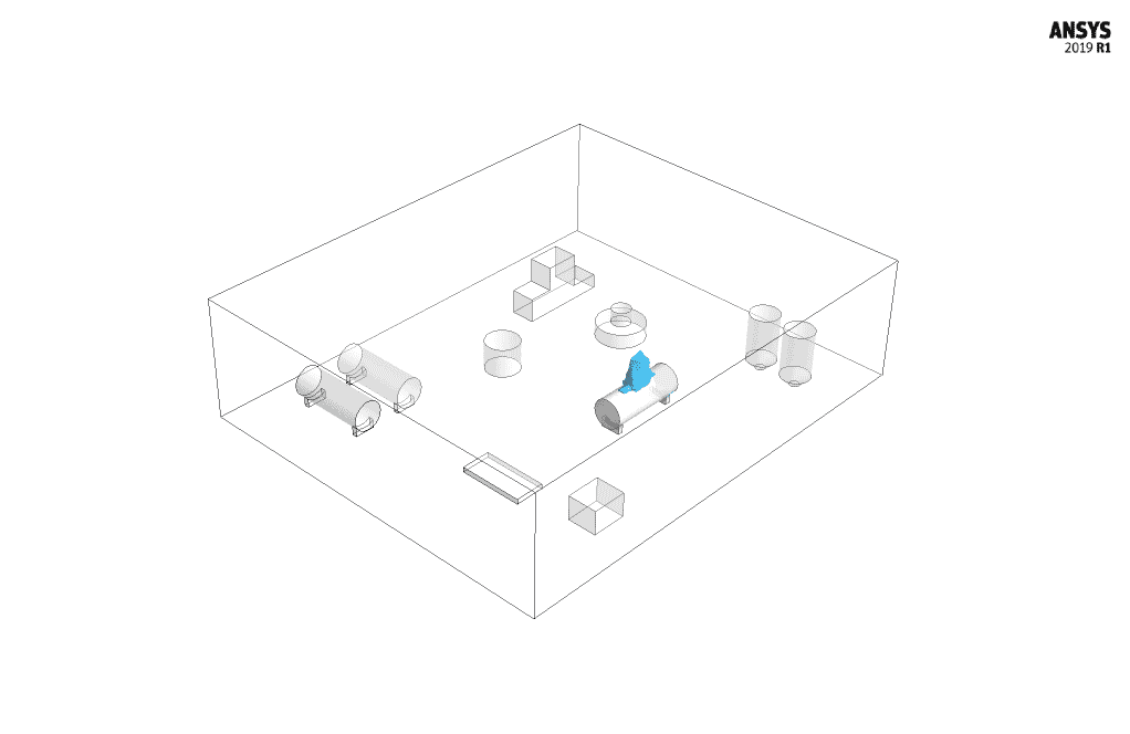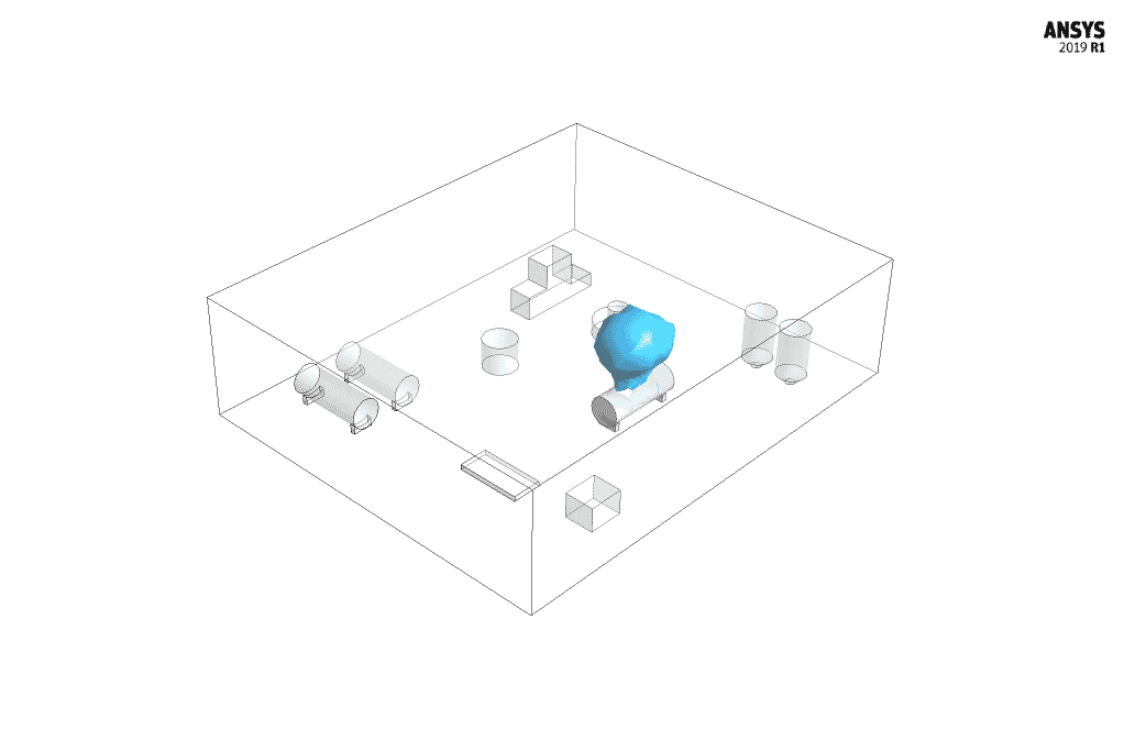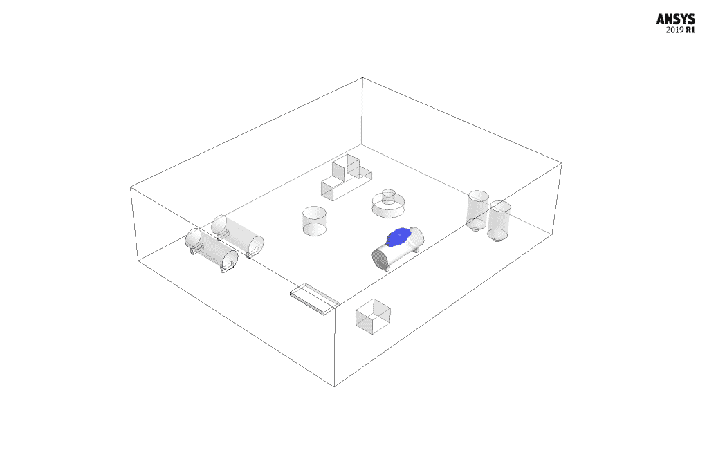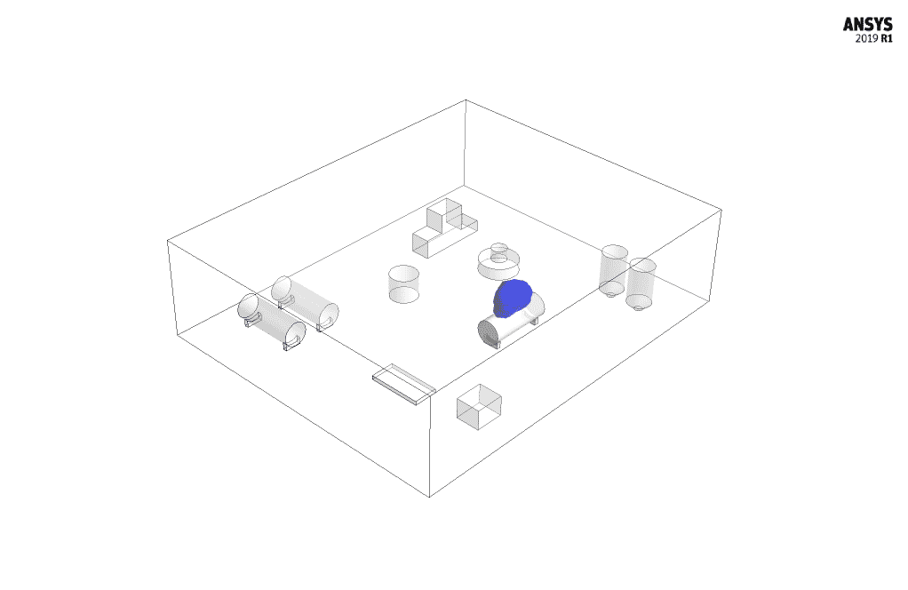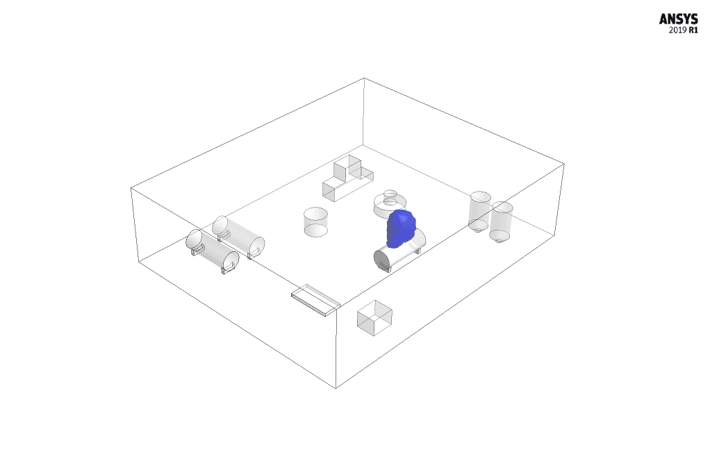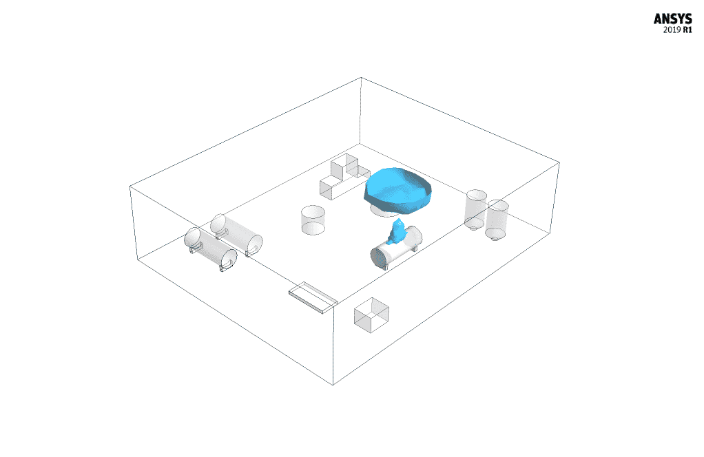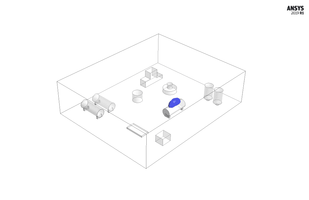 The present problem simulates the combustion reaction (Fire & Smoke) of a pressure tank in a factory via ANSYS Fluent software. A factory is modeled as a computational zone. Several elements have been modeled within this space, including tanks, plates, boxes, etc. A cylindrical pressurized tank leaks, and flammable methane gas leaks into the tank’s outer environment. At this time, the contact of free ambient airflow with methane leads to reaction.
