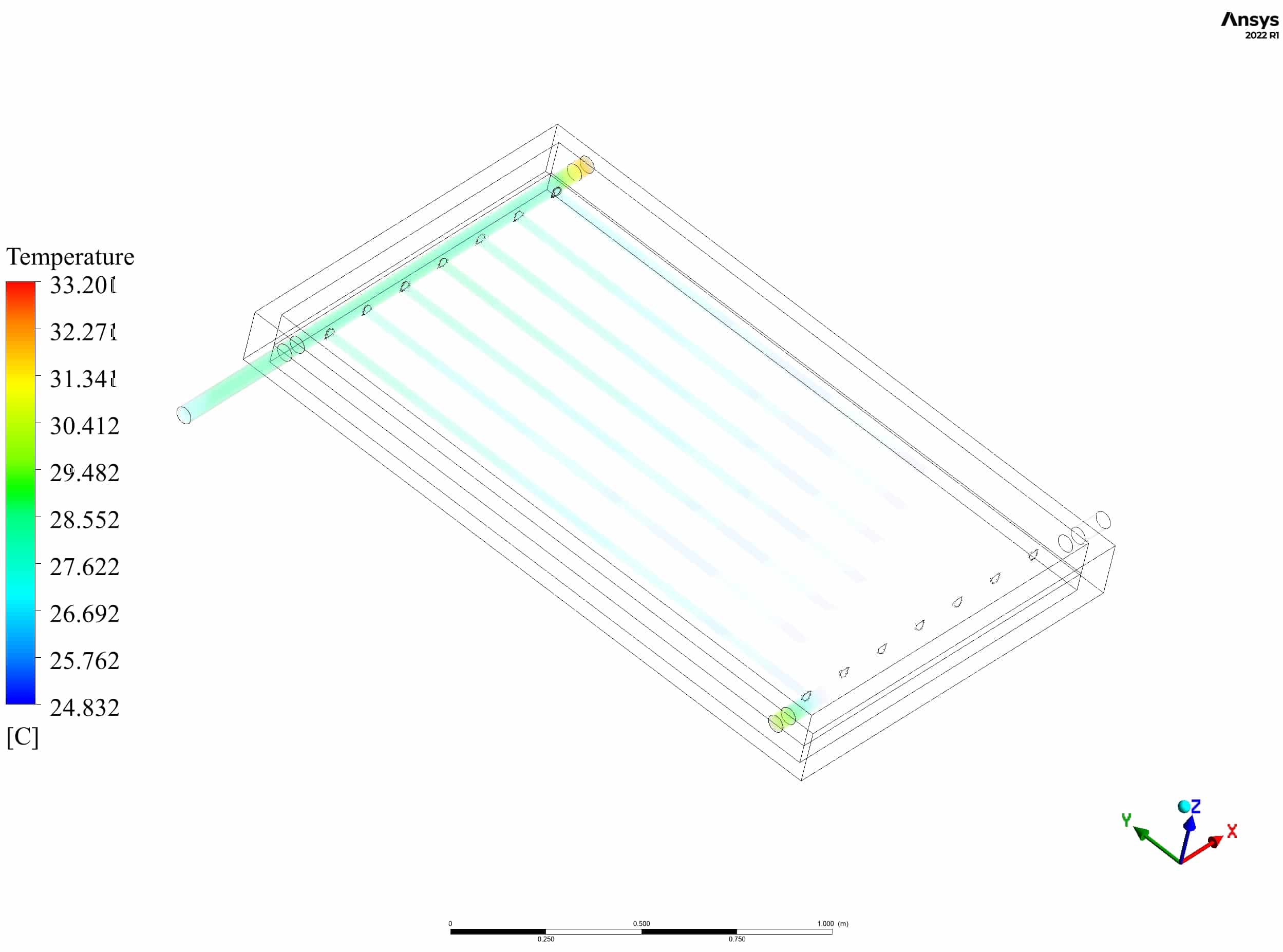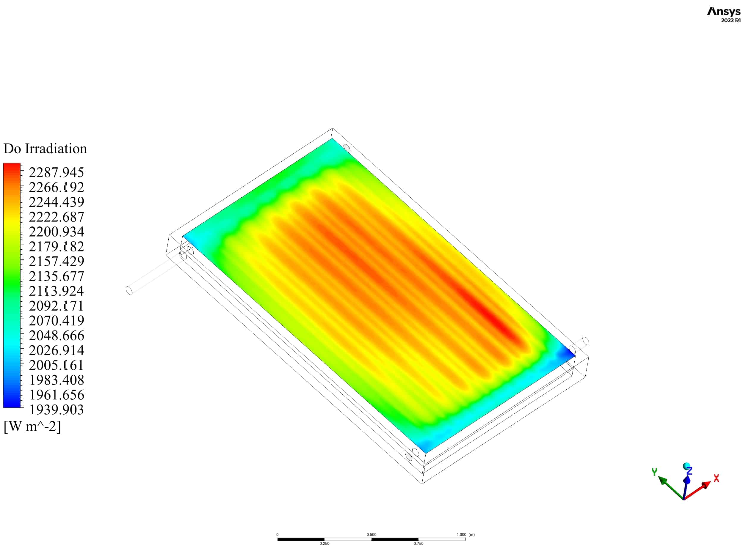 In this simulation, we investigate radiation’s effects on the water’s temperature passing through pipes in an FPSC located in Doha with a 15-degree tilt angle using ANSYS Fluent software.