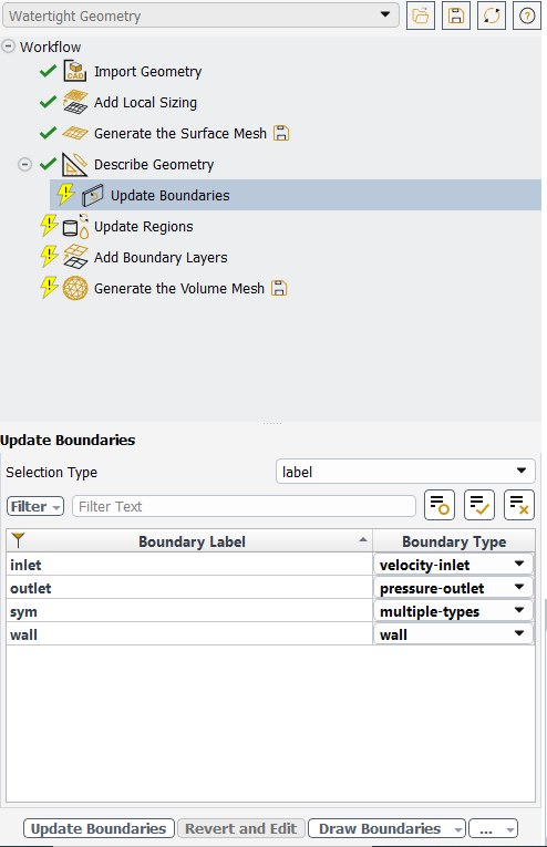 After reviewing and modifying boundary types where necessary, the “Update Boundaries” feature was used. This step confirmed all boundary definitions and prepared the model for subsequent meshing and solver setup.