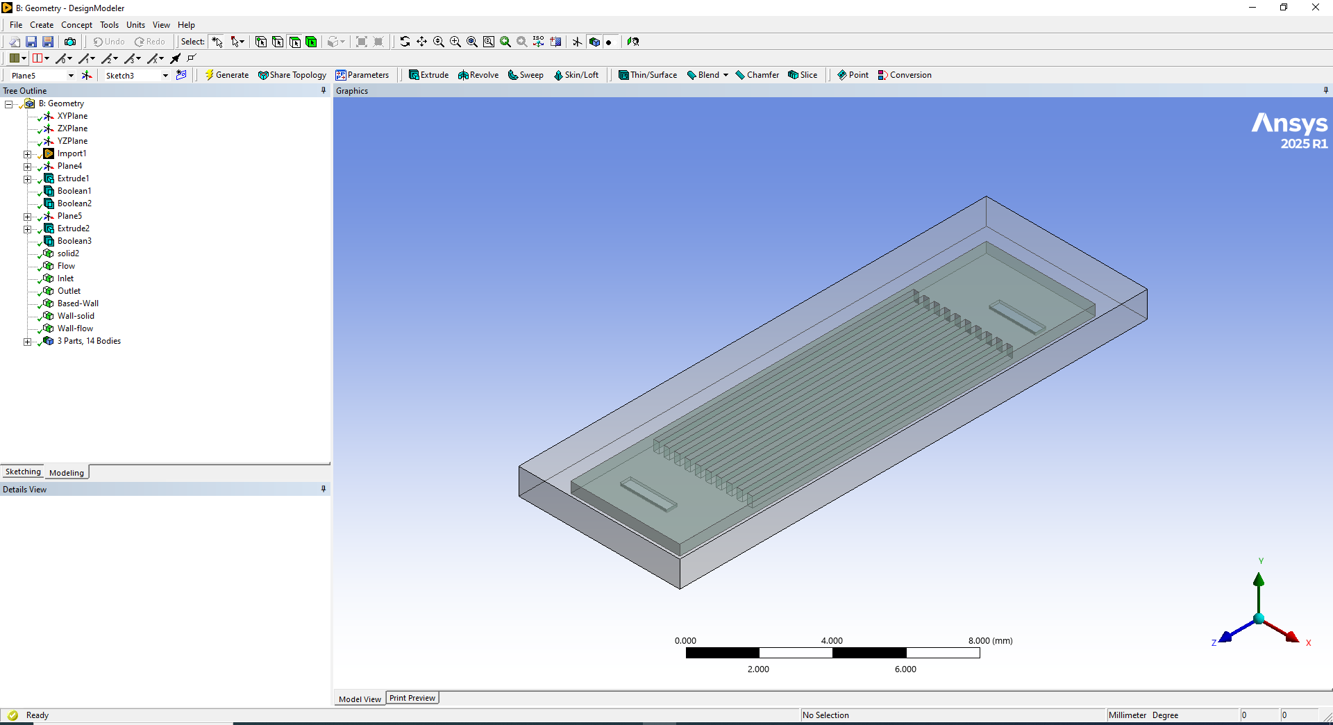 In this session, a heat exchanger geometry was created in Design Modeler and imported into Fluent Meshing. Named selections were applied in the CAD environment to facilitate automatic boundary recognition. Local sizing was added to control surface discretization and generate a surface mesh. The geometry was defined as both fluid and solid domains to prepare for region identification and assignment.