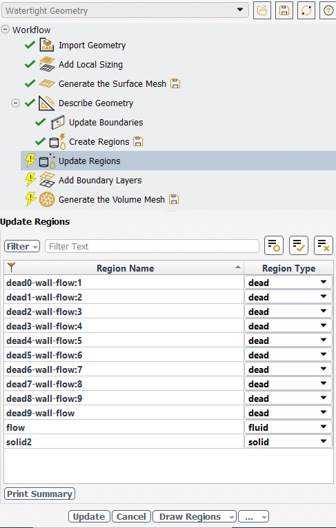 - The Update Regions interface allowed conversion of dead zones to fluid or solid zones as needed, ensuring proper region assignment before volume mesh generation.