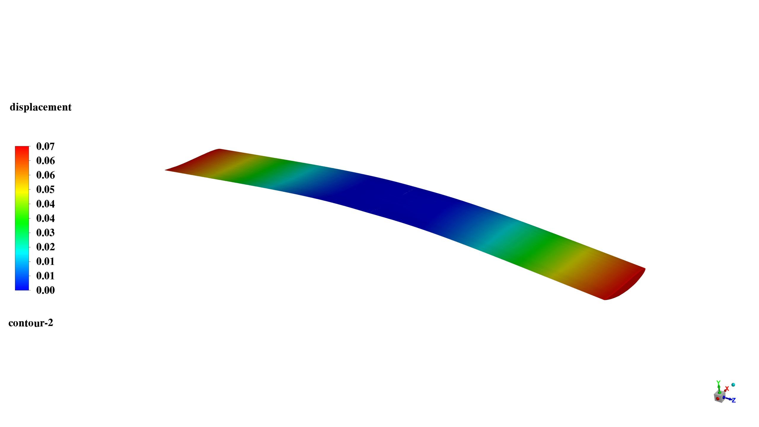 The displacement contours show the structural response of the airfoil to the aerodynamic loads. The maximum displacement of 0.07 units (presumably meters or millimeters, depending on the scale) occurs at the trailing edge of the airfoil, with a gradual decrease towards the leading edge. This deformation pattern is consistent with the expected bending of an airfoil under aerodynamic loading.