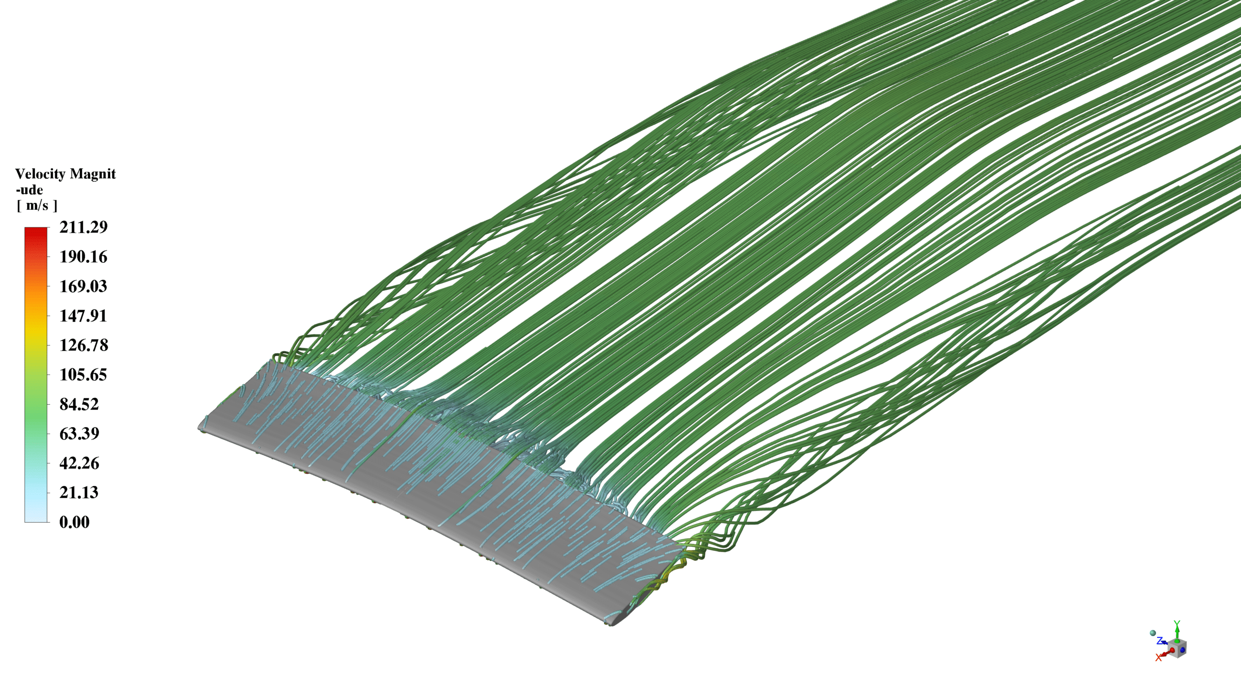 The streamlines visualization provides insight into the flow patterns around the airfoil. The streamlines show smooth flow over most of the airfoil surface, with some evidence of flow separation near the trailing edge, as indicated by the curling of streamlines in this region.