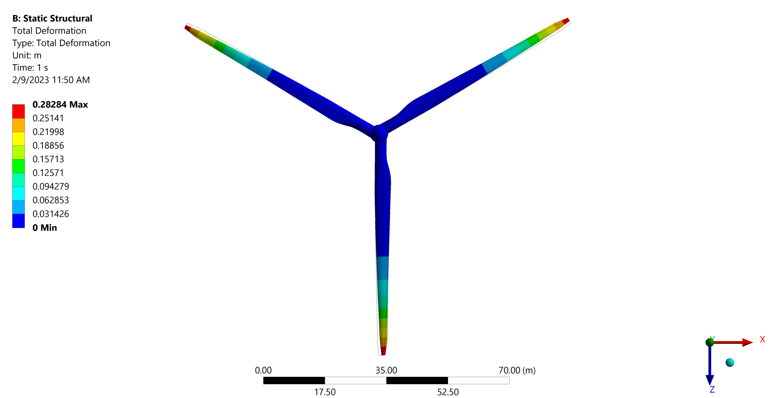 The total deformation was around 0.2 m at the tip of the blades. Also, the bending stress and strain have been analyzed too.