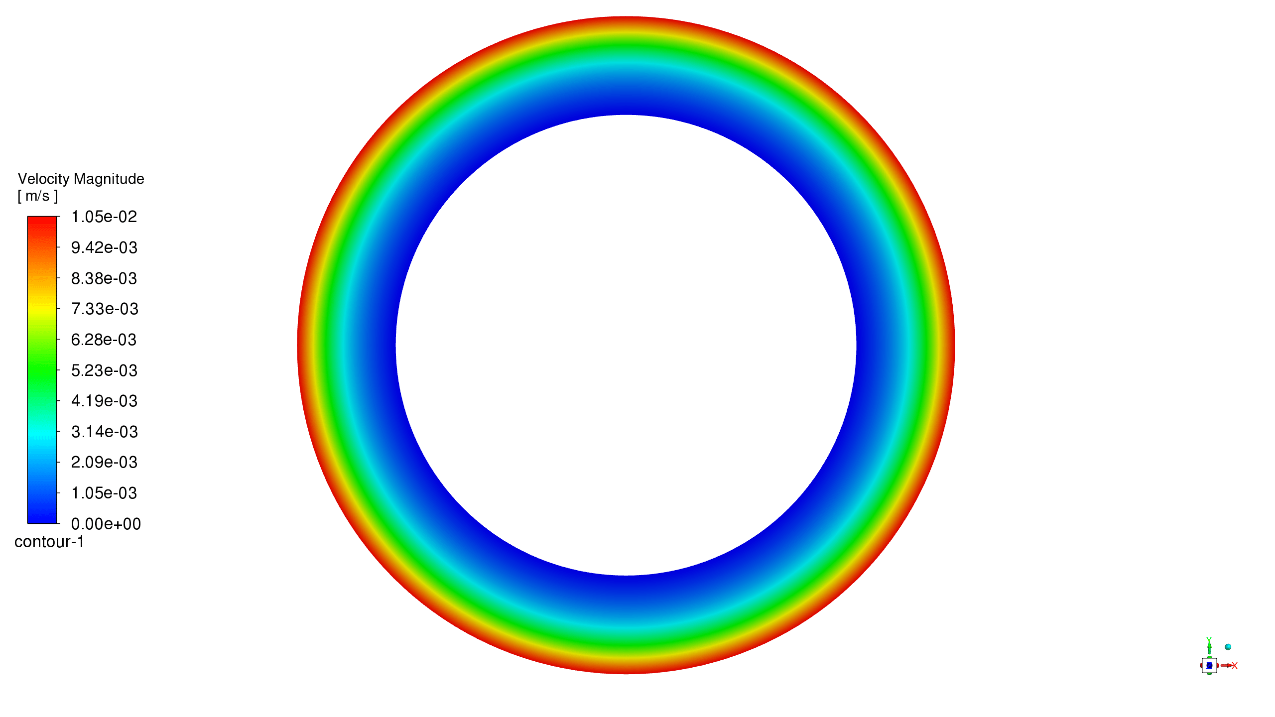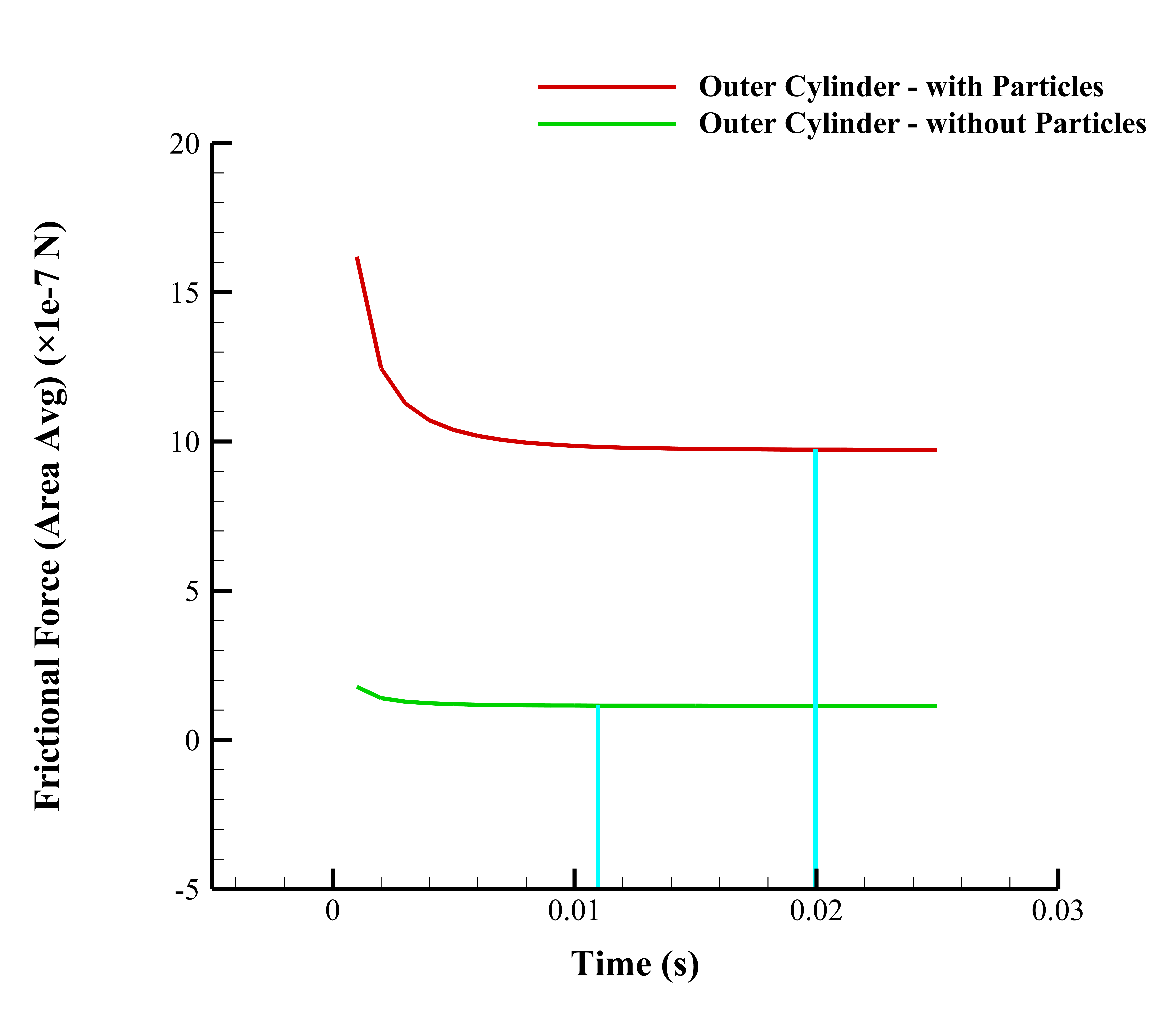 - As it is clear from the plots, for the inner cylinder and without the presence of particles, the problem reached a steady state after 27 milliseconds, and with the presence of particles, the problem became steady after 34 milliseconds. Also, for the outer cylinder without the presence of particles, after 11 milliseconds and with the presence of particles, after 20 milliseconds, the problem has become steady state. Therefore, in general, it can be concluded that for the condition of without the presence of particles, the problem has reached a steady state after 27 milliseconds and for the condition of with the presence of particles, the problem has reached a steady state after 34 milliseconds.
