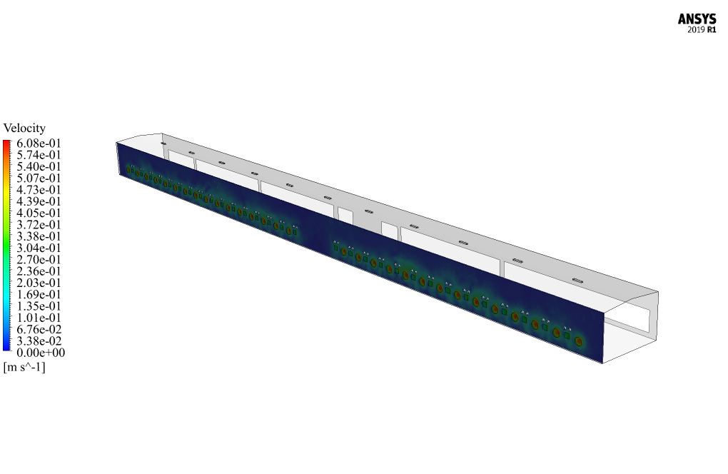 Therefore, it was decided to use a fan to reduce the temperature. Thus, 32 small fans are used in the second simulation, each with 11,000 CFM. It is concluded that the room temperature was improved and reduced to 36 ° C.