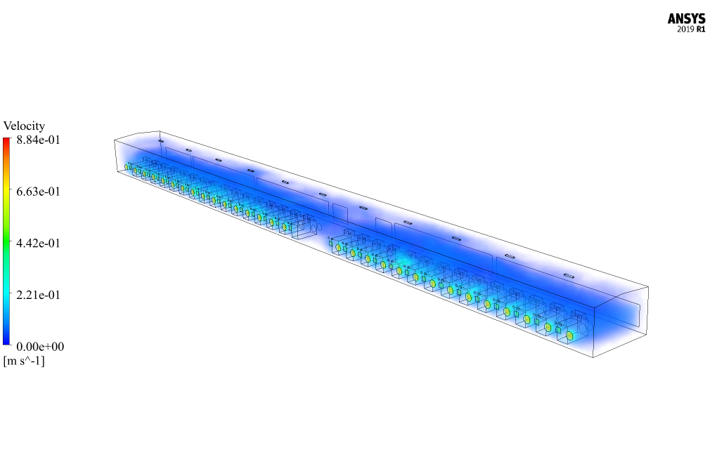 The generator room is initially simulated without a fan; it is observed that the room temperature with 32 generators is very high. Thirty-two fans with 11,000 CFM are then used, which decreases the temperature considerably.