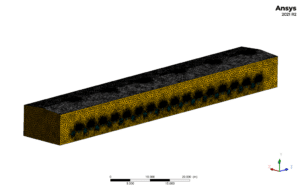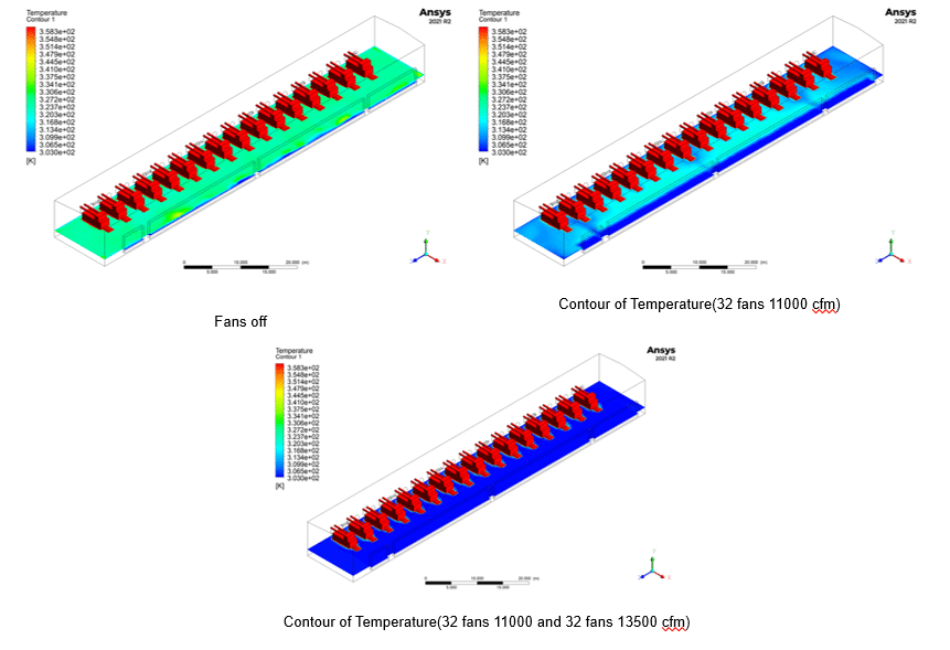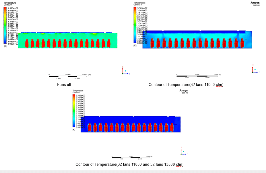 Dear customer, we’re glad you found the study informative! For reduction in computational cost, symmetry allowed us to model only half of the actual physical space since the other half would behave identically, eliminating the need to calculate the entire space. Concerning the final Temperature distribution, once all fans were operational, airflow velocity was enhanced, creating a uniform temperature distribution equivalent to the ambient outside Temperature of 30 °C across the generator room.