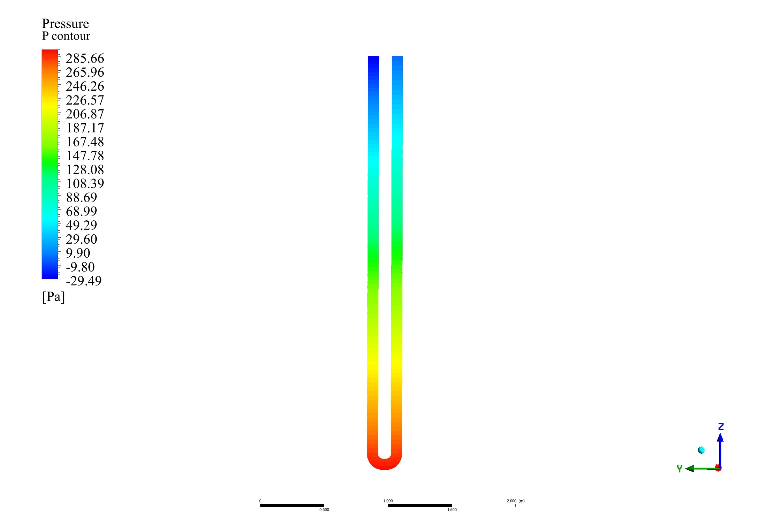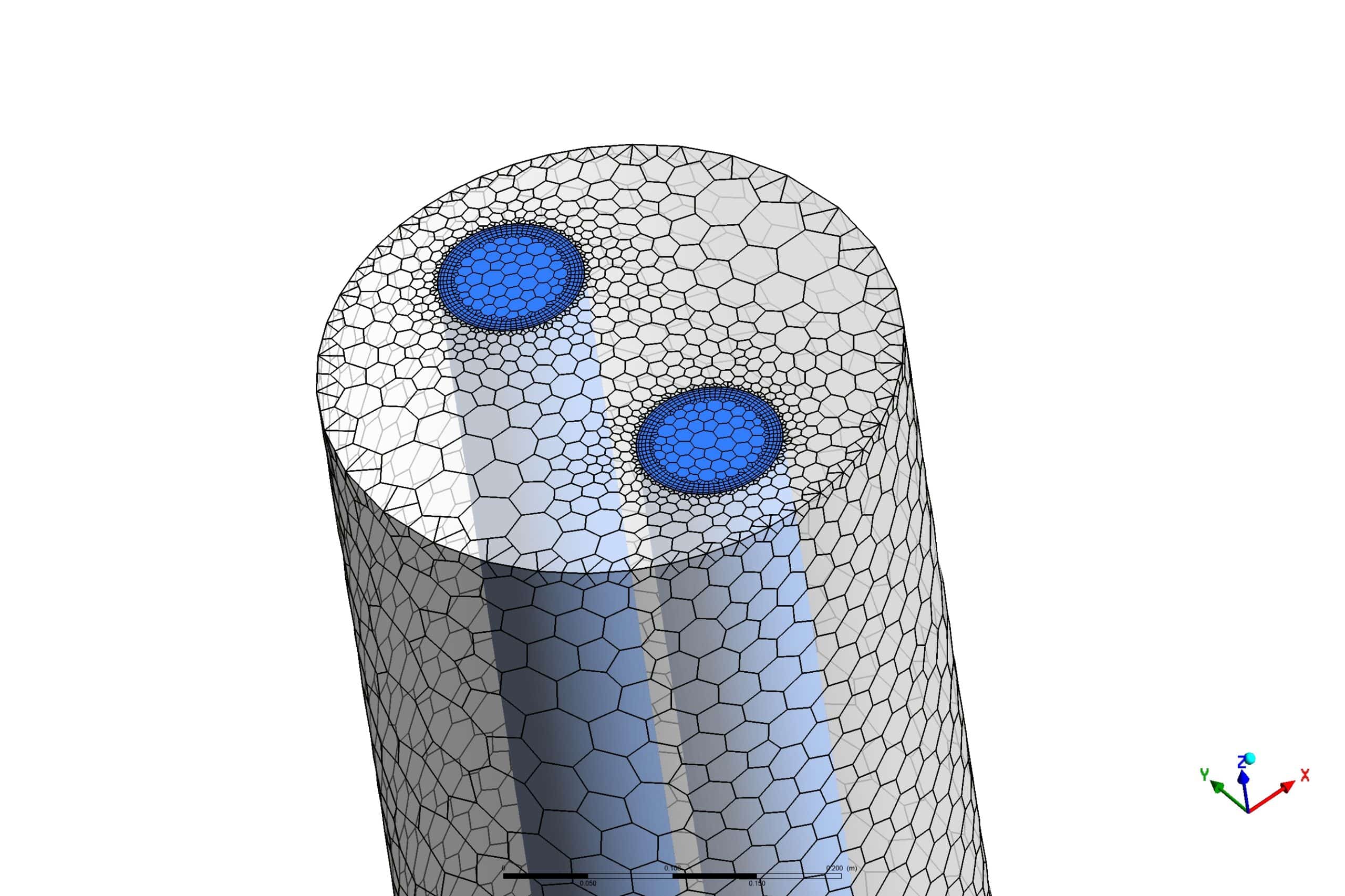 We designed the U-tube with an inlet and outlet diameter of 0.0875 meters. It is surrounded by a borehole of 0.35 diameter and 6 m height inside the ground zone, a cylinder with a diameter of 3 m.