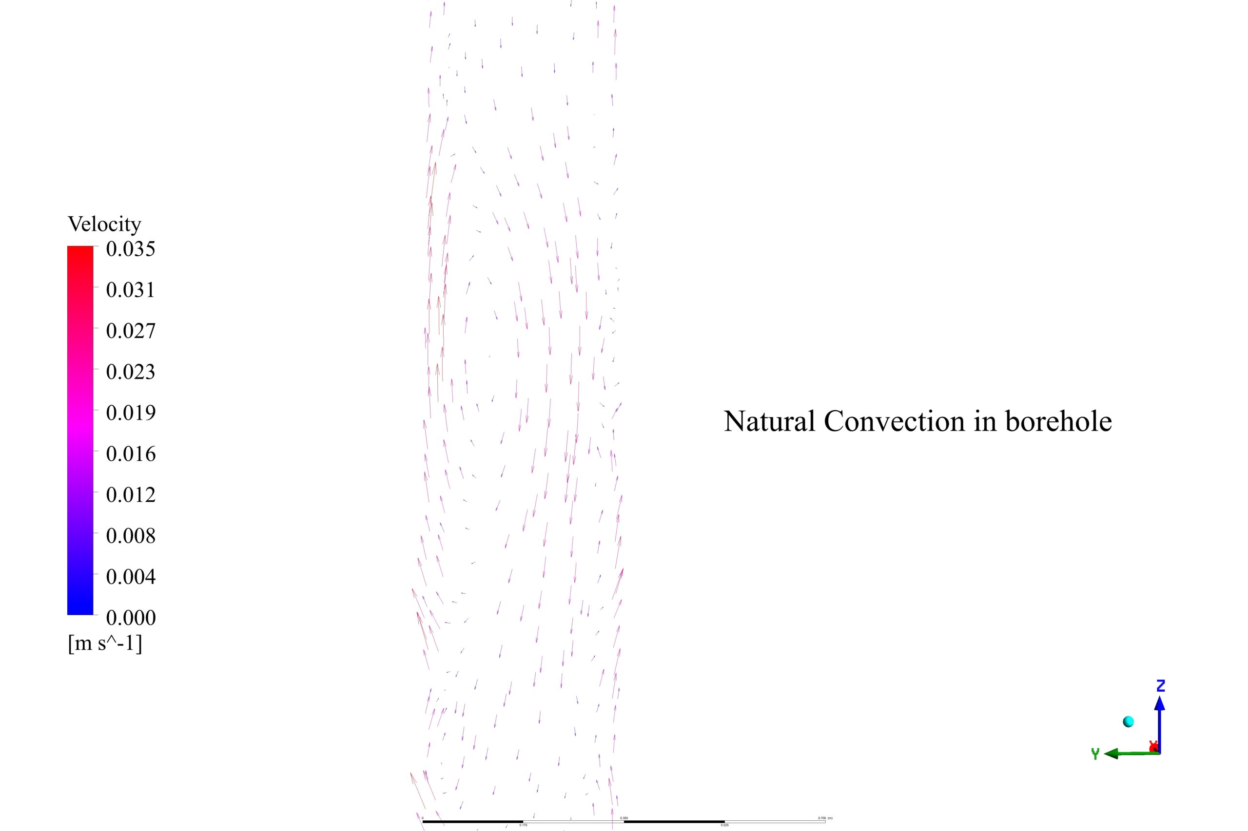 The natural convection in the borehole is initiated by the temperature gradient due to the geothermal heat from the ground. As the working fluid at the bottom of the U-tube absorbs heat, it becomes less dense and rises. This rising fluid is replaced by cooler, denser fluid moving down, creating a convective flow. The vortex forms at the bottom part of the hole due to the buoyant forces acting on the heated fluid combined with geometrical constraints of the borehole, creating a rotational flow.