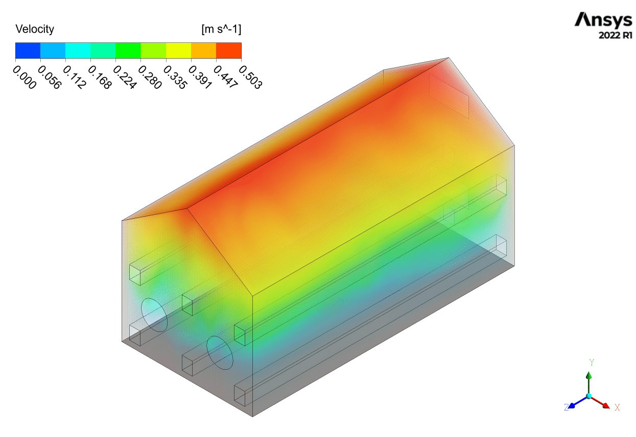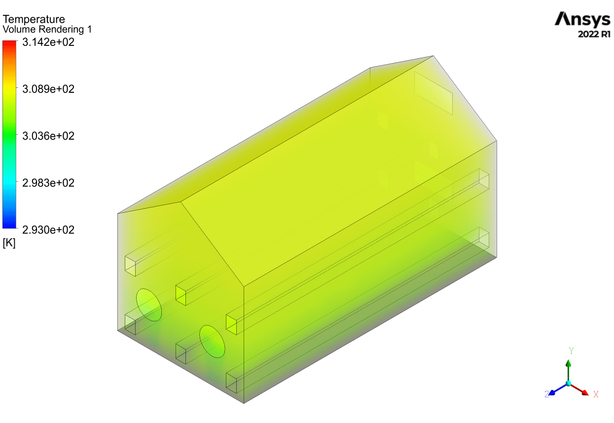 In the first step, we simulate the greenhouse in its initial condition considering two industrial fans. After the simulation, the volume average temperature is reported as 307.22K and an H2O mass fraction of 0.24% & 6.37 ppm ammonia, revealing the greenhouse’s critical condition.
