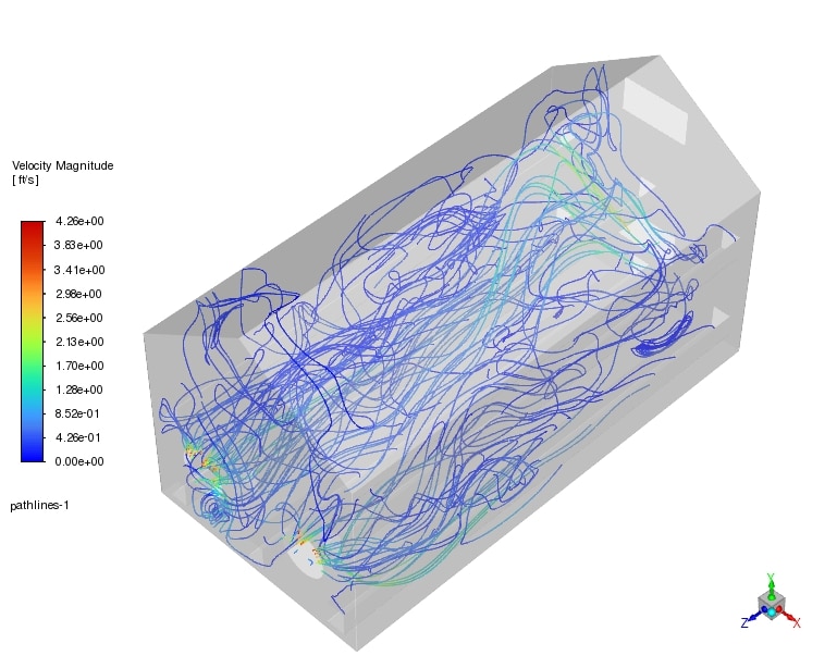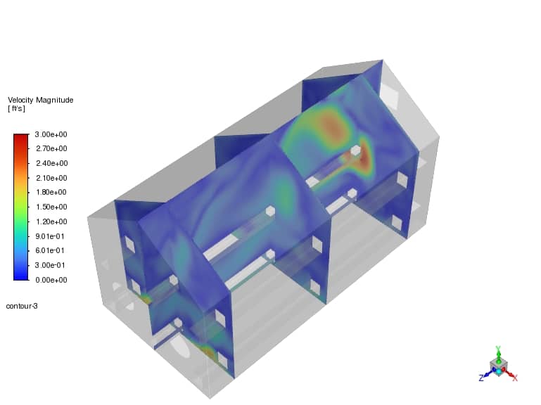 Also, the extracted temperature and velocity contours show the inefficient ventilation system. This couldn’t recirculate air effectively, and the bulk air remains constant except around the fan’s height region. This couldn’t satisfy either of the criteria.