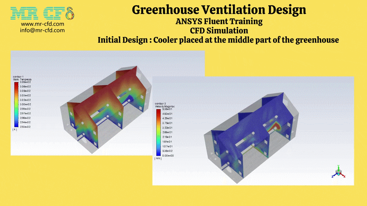 The basic design of this greenhouse only consists of two industrial fans. In the first step, the MR-CFD simulation expert group performed a numerical simulation and analyzed its results. The experts concluded that the present design does not satisfy the three objective factors. So, fans alone cannot improve the greenhouse’s air condition.