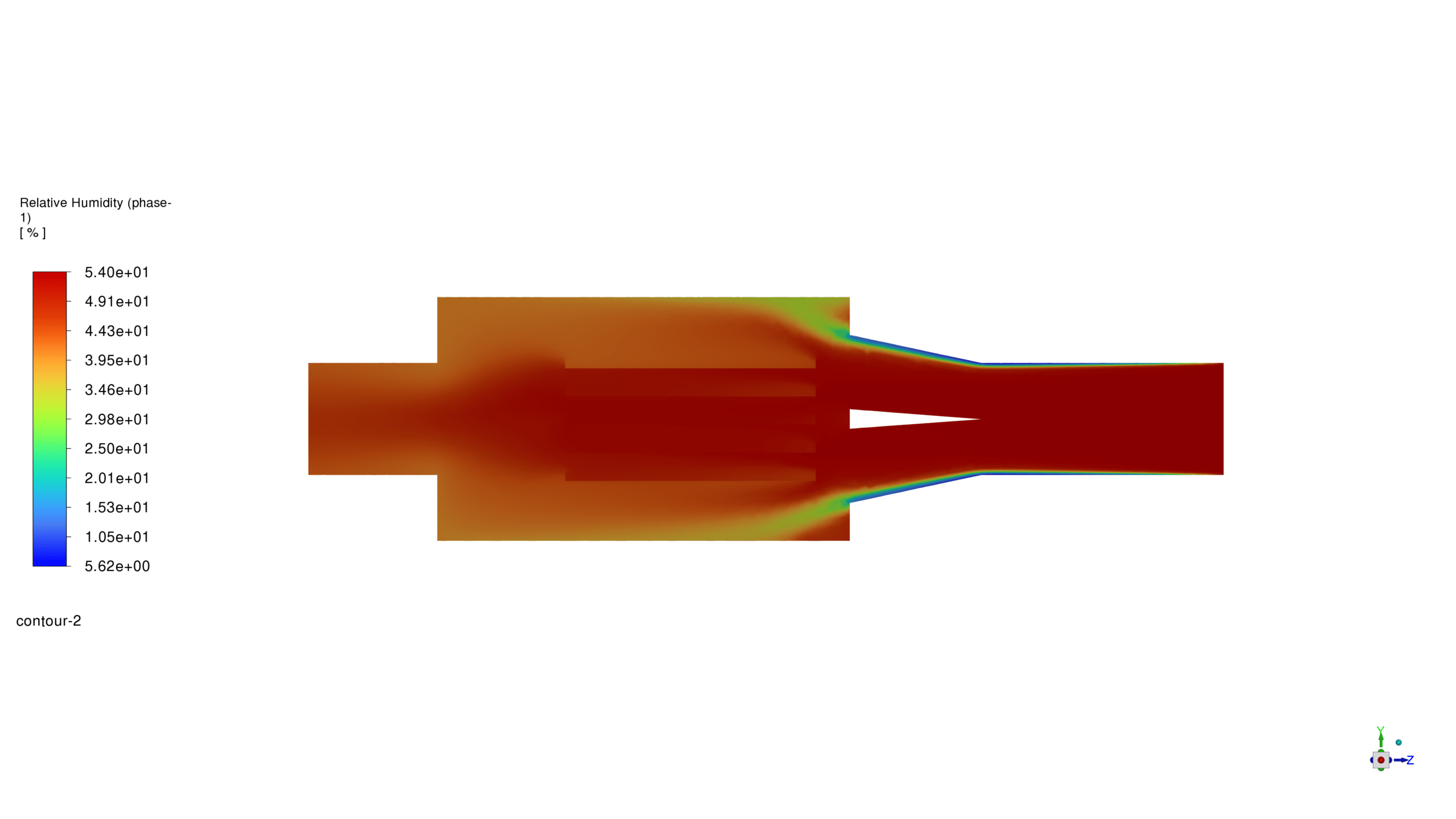 The relative humidity plot shows a gradual reduction in humidity as the air passes through the dryer. The regions near the wood plates demonstrate a higher moisture concentration due to evaporation. The air’s lower humidity towards the outlet indicates effective moisture removal facilitated by the heat pump dryer.