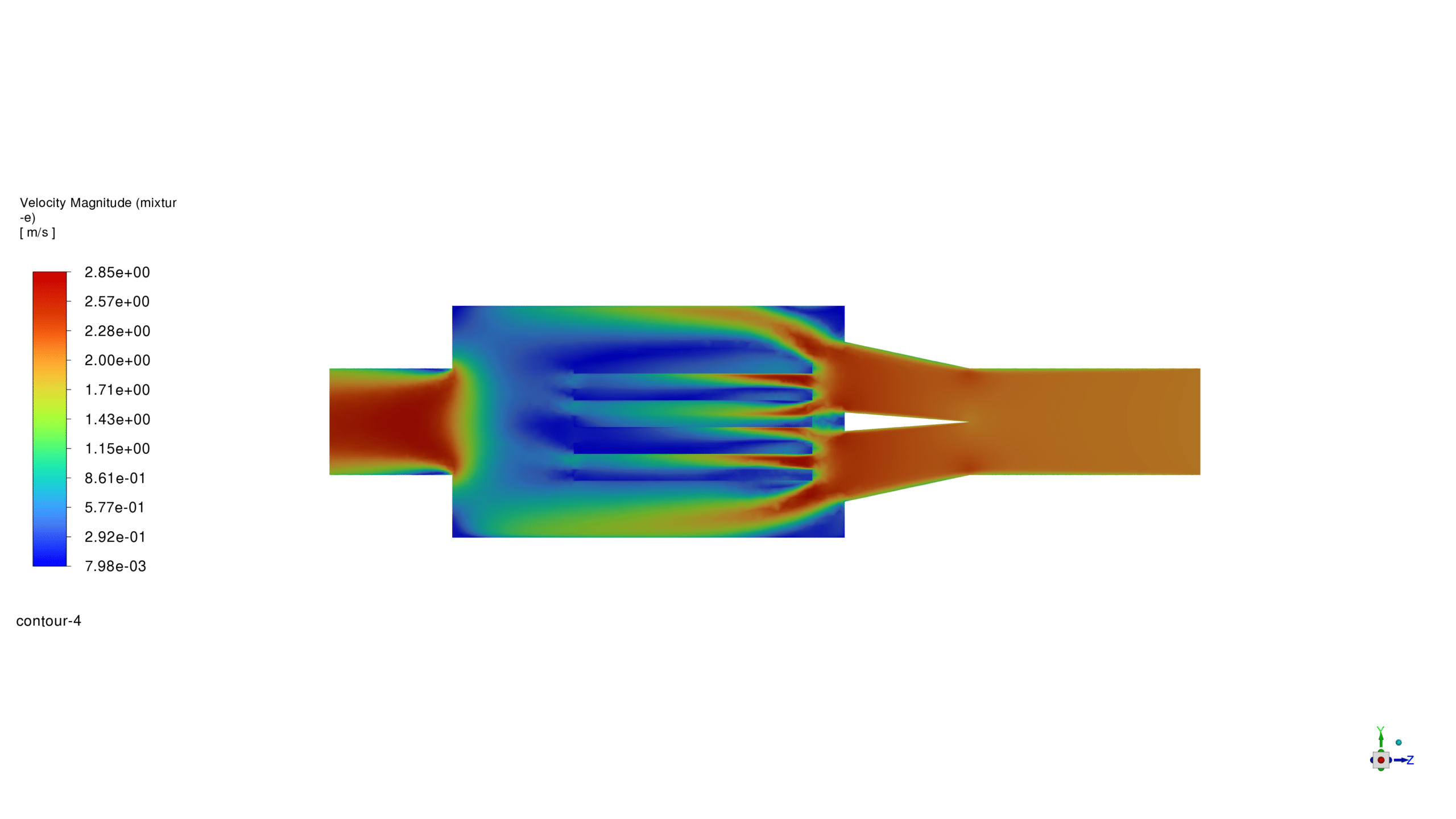 The velocity contour reveals airflow patterns inside the dryer. The air accelerates through constricted regions and interacts effectively with the wood plates. This enhances mass and heat transfer processes, which are critical for efficient drying. The uniform distribution across the plates ensures balanced drying across all surfaces.