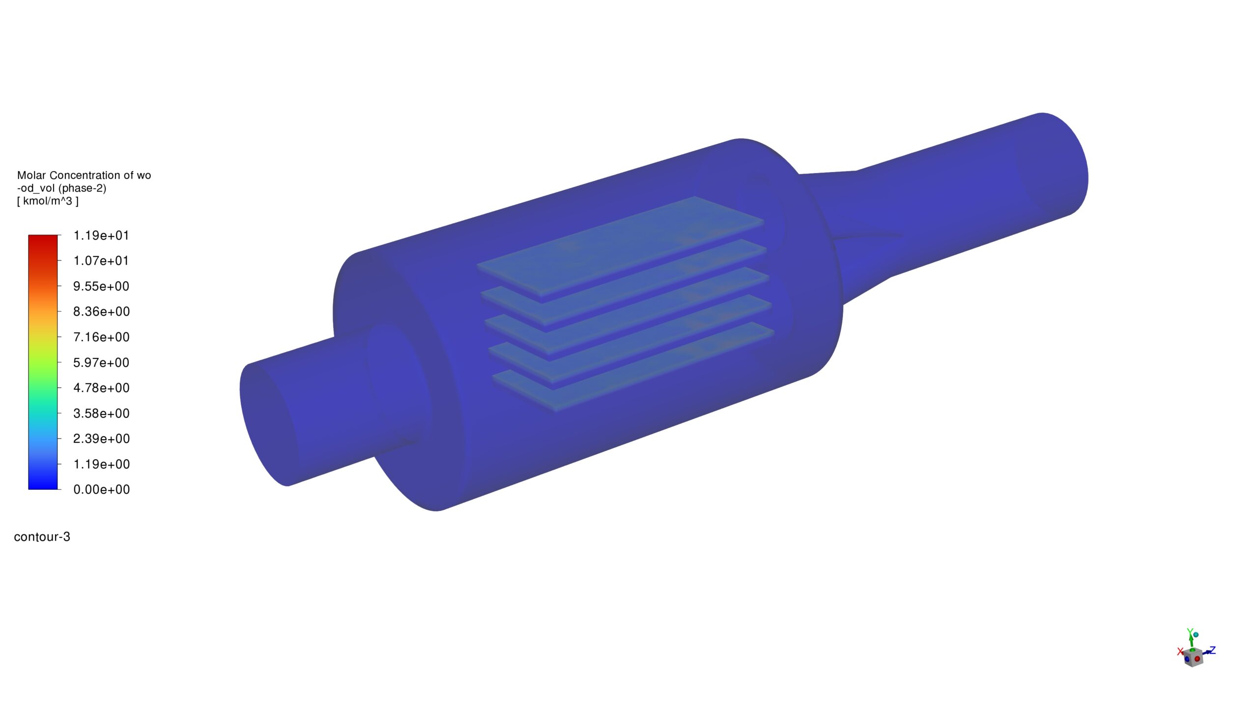 The molar concentration plot highlights the distribution of water vapor within the dryer. Near the wood plates, the vapor concentration is significantly higher, showcasing the evaporation process. The airflow removes the moisture, demonstrating the system’s efficiency in transporting water vapor to the outlet.