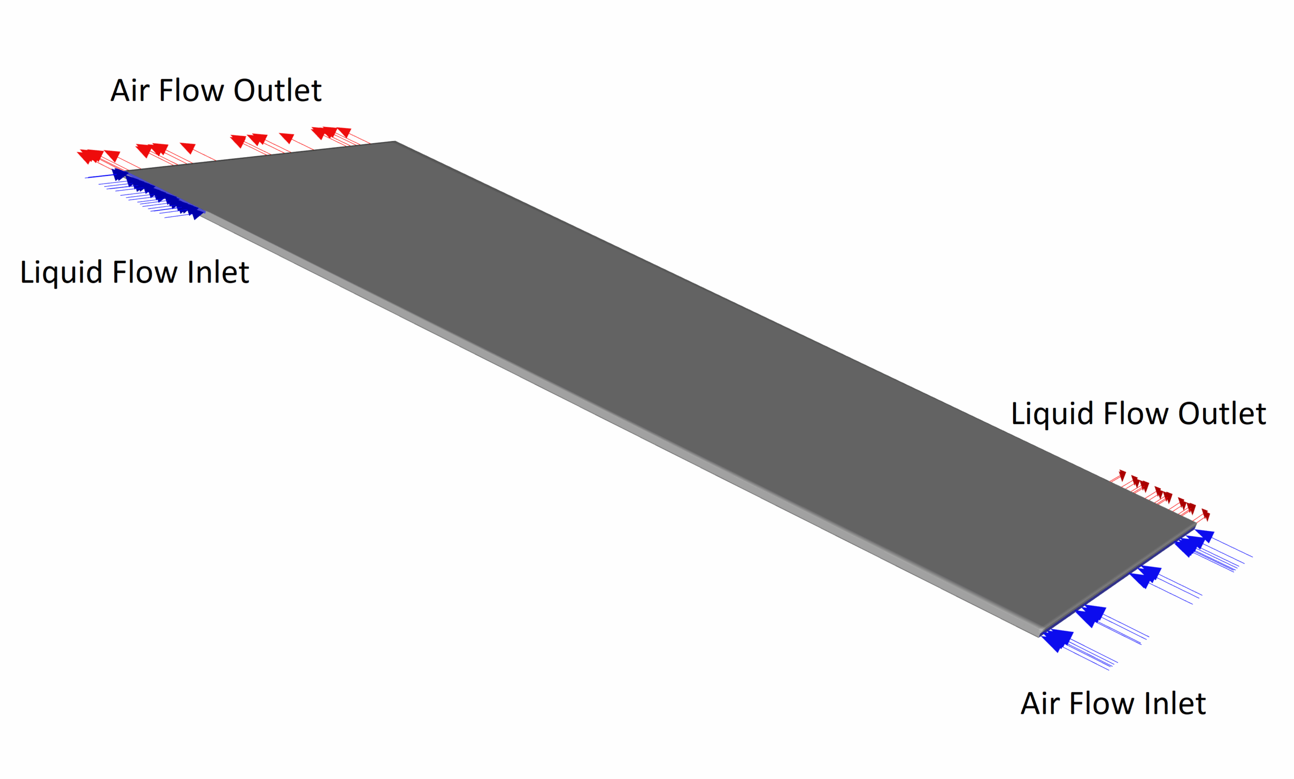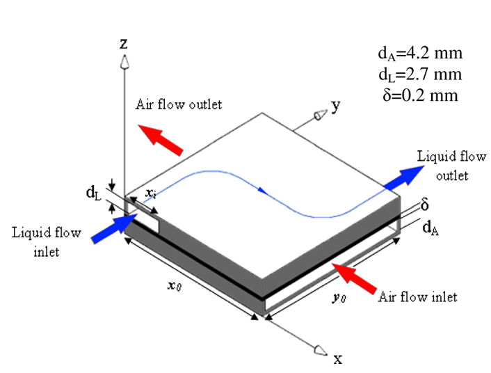 The dissolved fluid in the model has a higher temperature than the air flow; therefore, the goal of the problem is to cool the outlet of the hot fluid flow by the air flow. The overall goal of the present problem is to study the fluid behavior and heat transfer of the flows and to investigate the efficiency of the heat exchanger operation.