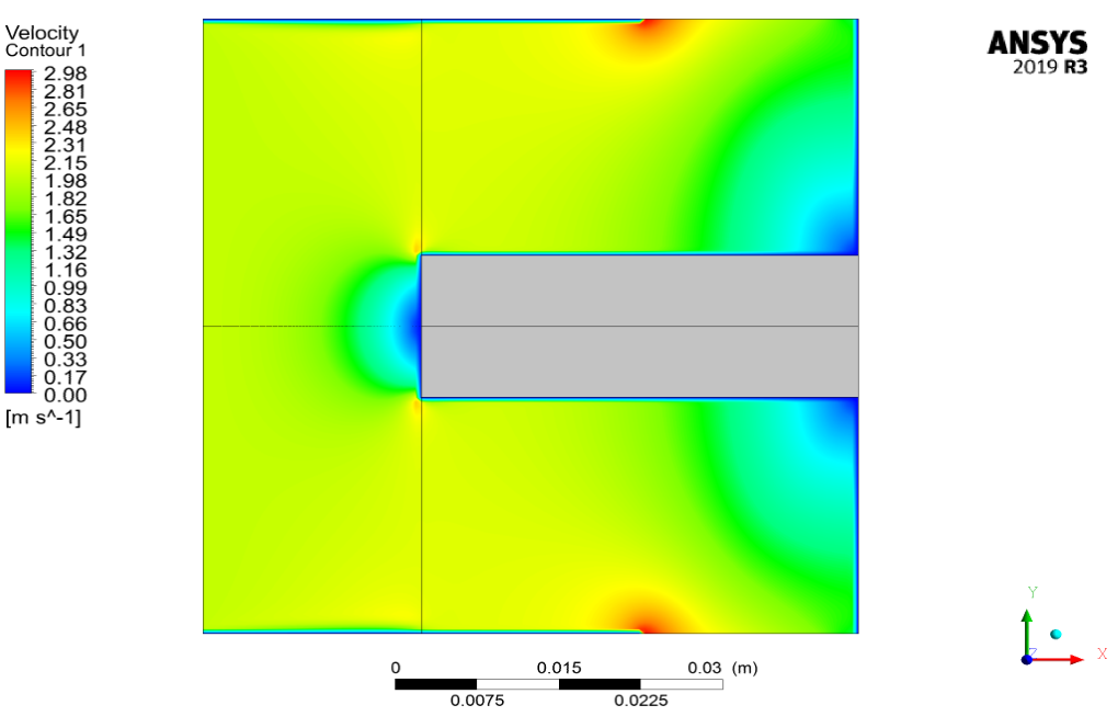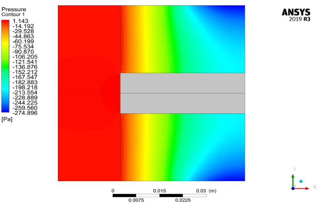 As seen in the pressure contour, the flow pressure behind the porous medium significantly differs from that of the outlet boundary due to the resistance that the porous medium imposes on the system.