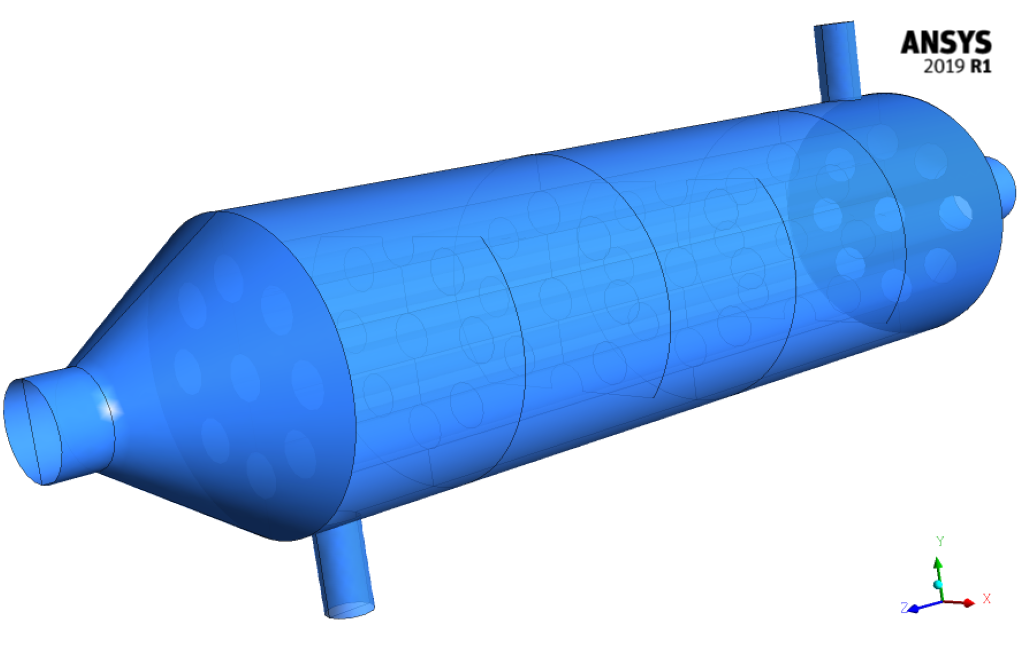 3-D Geometry is designed by Design Modeler software. In order to model the four-layer baffle shell and tube heat exchanger to increase the effects of shell fluid circulation, geometry properties are described below in the table.