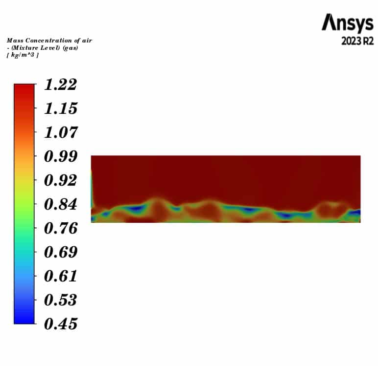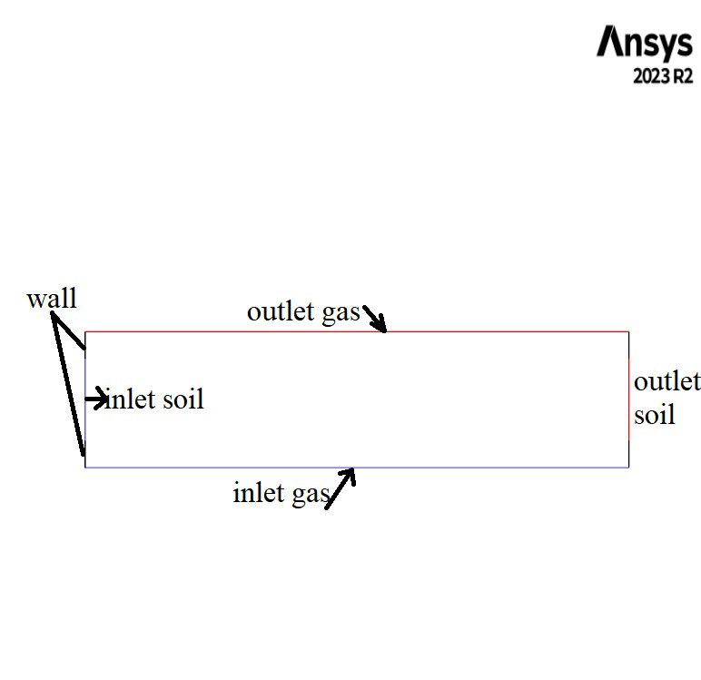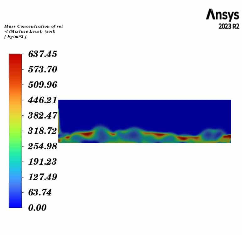 In this project, a horizontal fluidized bed is simulated with the purpose of drying incoming soil containing moisture. The soil enters the fluidized bed at a mass flow rate of 1 kg/s with a water mole fraction of 0.1. Air flows from the bottom at a velocity of 1.7 m/s and a temperature of 393 K, causing the moisture in the soil to evaporate inside the fluidized bed. The geometry used in this project is two-dimensional, with a fluidizer height of 0.5 m and a length of 2 m.