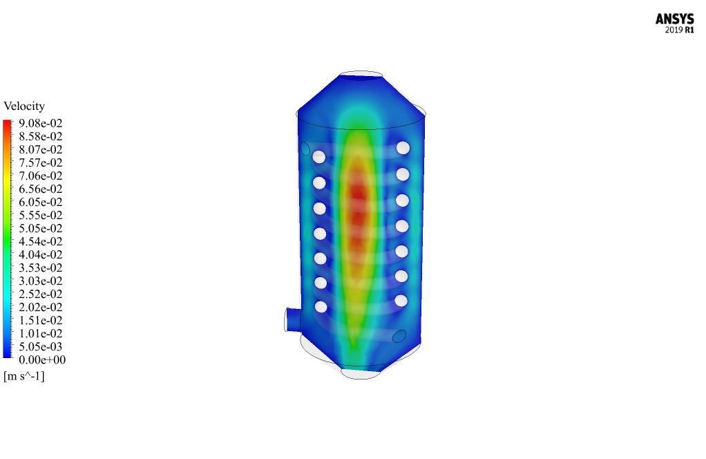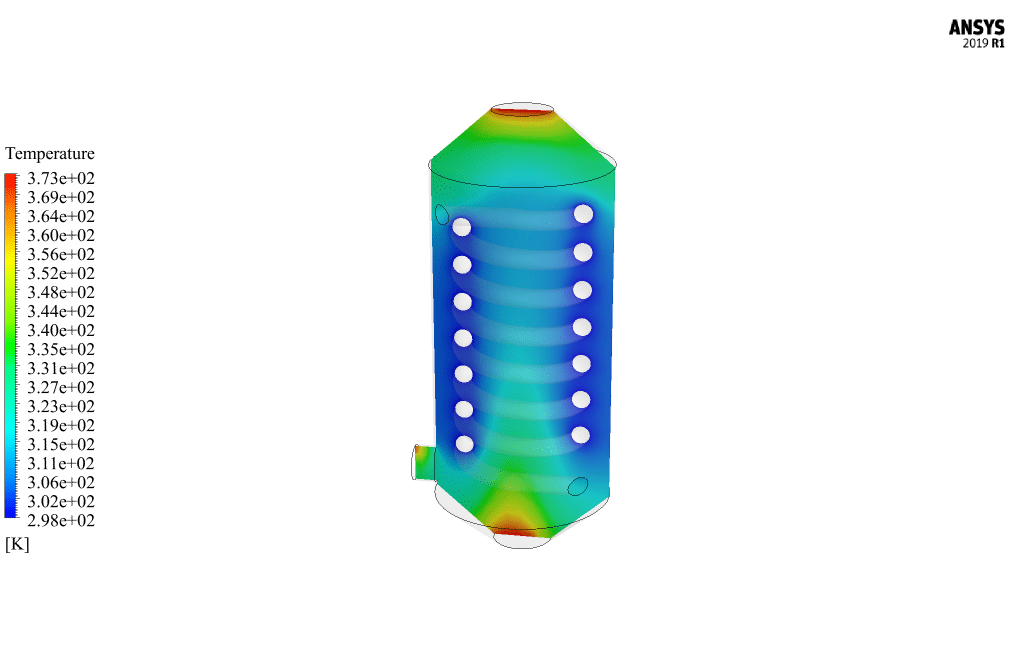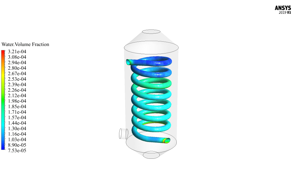The results show the phase change in the regions around the cold spiral tube. The temperature contour shows that the vapor temperature in the vicinity of the cold pipe has decreased and reached below the saturation temperature. So, condensation (turning vapor into water) must take place.
