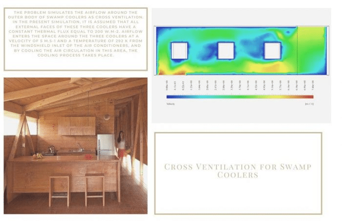 Practical exercise number 1 simulates the airflow around the outer body of swamp coolers as cross ventilation. The function of water cooler systems is such that the outside warm air is sucked into their building and meets the pumped water flows in the cooler. The water flow receives the latent heat it needs to evaporate from the perceptible heat of the incoming airflow, and as a result, it evaporates. In project number 2, the movement of the cooling airflow inside a room applying a swamp cooler is investigated. The air inside the room is cooled using a swamp cooler and is distributed inside the room space. The standard k-epsilon model is exploited to solve turbulent flow equations, and the Energy equation is activated to calculate the temperature distribution inside the computational domain. Problem number 3 simulates the heat transfer from a floor heating system into a room. In fact, this heating system is built into the floor of the room, which acts as a heat source. It is assumed that this heating system has a constant thermal flux of 166.6 W.m-2.