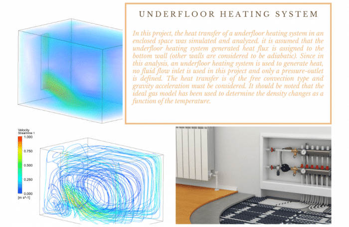 In practical exercise number 4, the heat transfer of an underfloor heating system in an enclosed space was simulated and analyzed by ANSYS Fluent. It is assumed that the underfloor heating system generated heat flux is assigned to the bottom wall (other walls are considered to be adiabatic). Since in this analysis, an underfloor heating system is used to generate heat, no fluid flow inlet is used in this project, and only a pressure outlet is defined. Problem number 5 simulates the airflow inside a room and the process of air conditioning. There are three sections for the entry of fresh air on the roof of the room; So that the airflow enters the interior of the room with a speed equal to 0.4 m.s-1 and at a temperature equal to 295 K. In project number 6, steady airflow in a storage container room with two walls is investigated. Container rooms are often used for the storage of industrial goods which are perishable and are required to be kept under influence of steady airflow for purpose of cooling and ventilation. In the present work, steady airflow is simulated in a 0.5 * 0.5 * 1 room with two walls against the airflow path, which represents containing chamber.