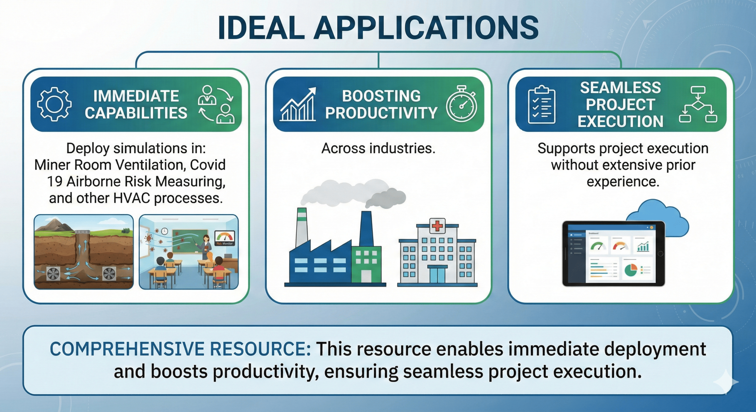 Teams gain immediate capabilities for deploying simulations in Miner Room Ventilation, Covid 19 Airborne Risk Measuring in a Classroom, and other HVAC processes, boosting productivity across industries. This comprehensive resource supports seamless project execution without extensive prior experience.