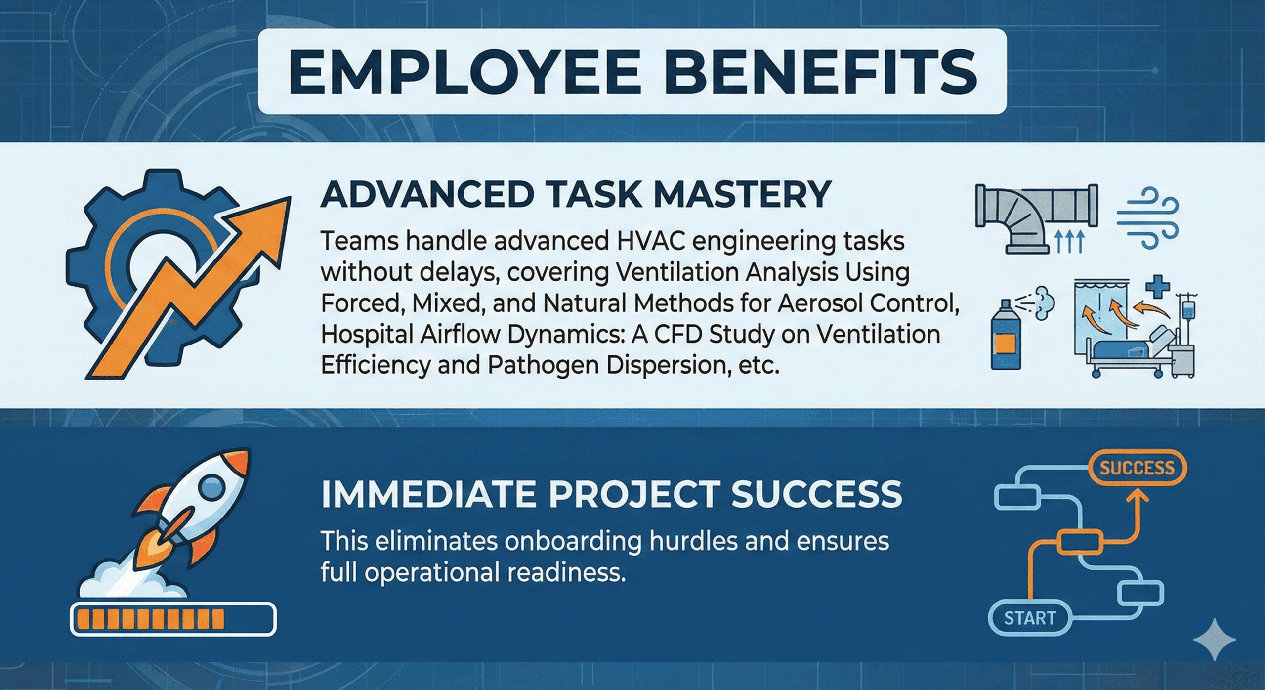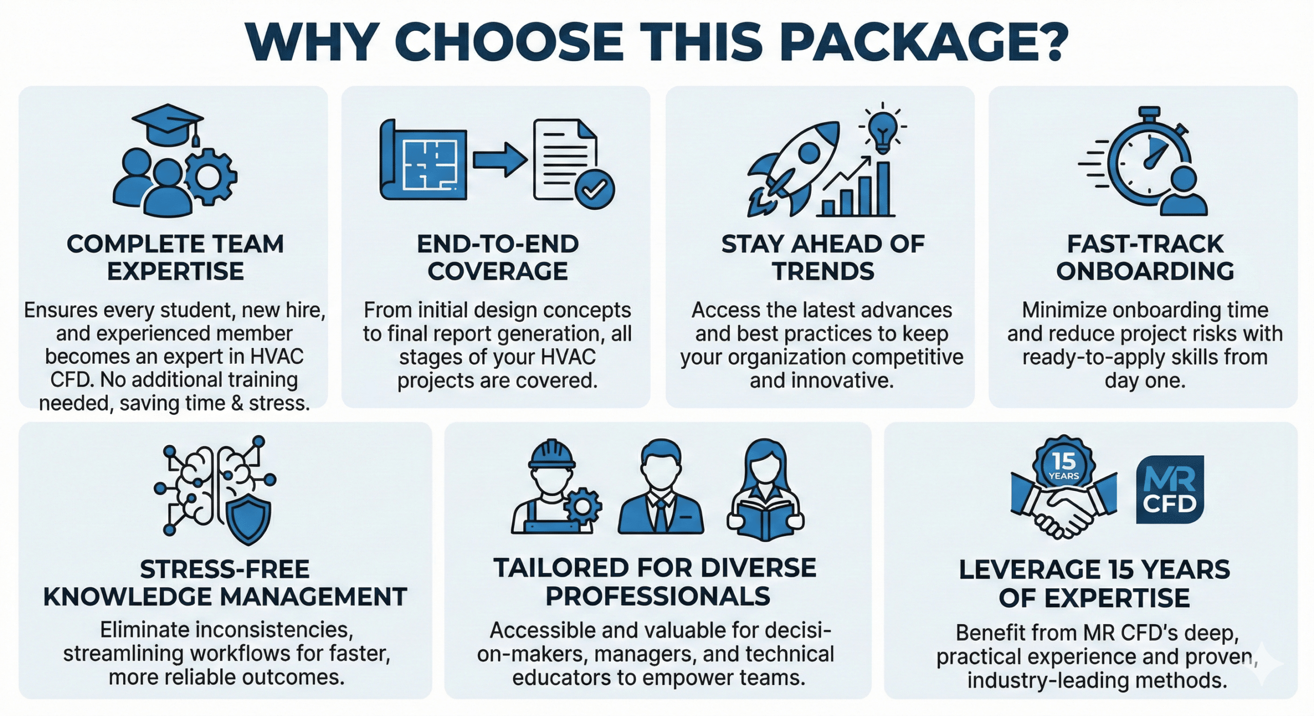 Complete Expertise for Your Team: Whether you have students, new employees, or an experienced team, our package ensures every individual becomes an expert in HVAC Engineering CFD simulation projects. No need for additional training, saving you valuable time and reducing stress.