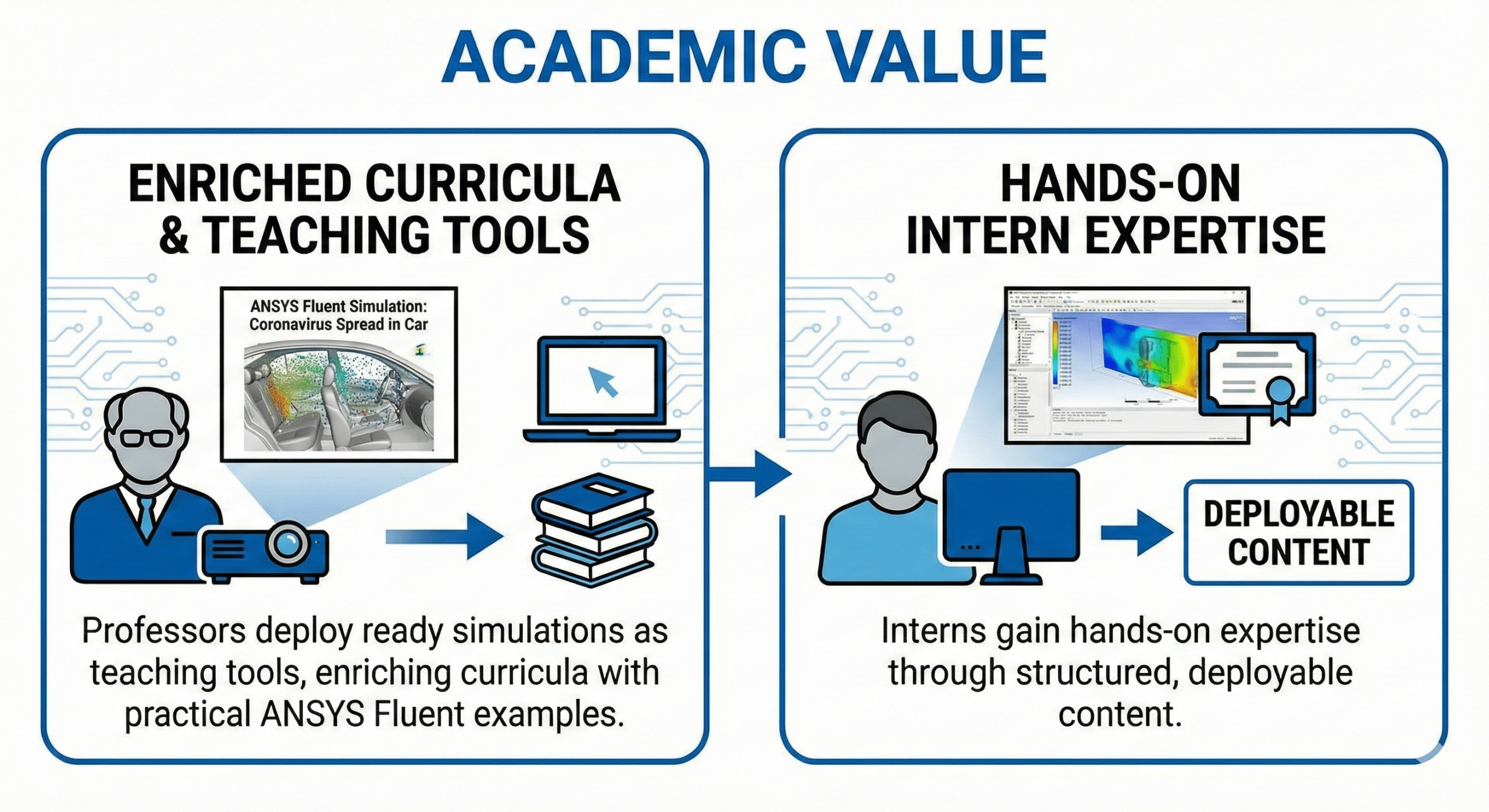 Professors deploy ready simulations as teaching tools, enriching curricula with practical ANSYS Fluent examples for the spread of the coronavirus in a Car due to coughing, and beyond. Interns gain hands-on expertise through structured, deployable content.
