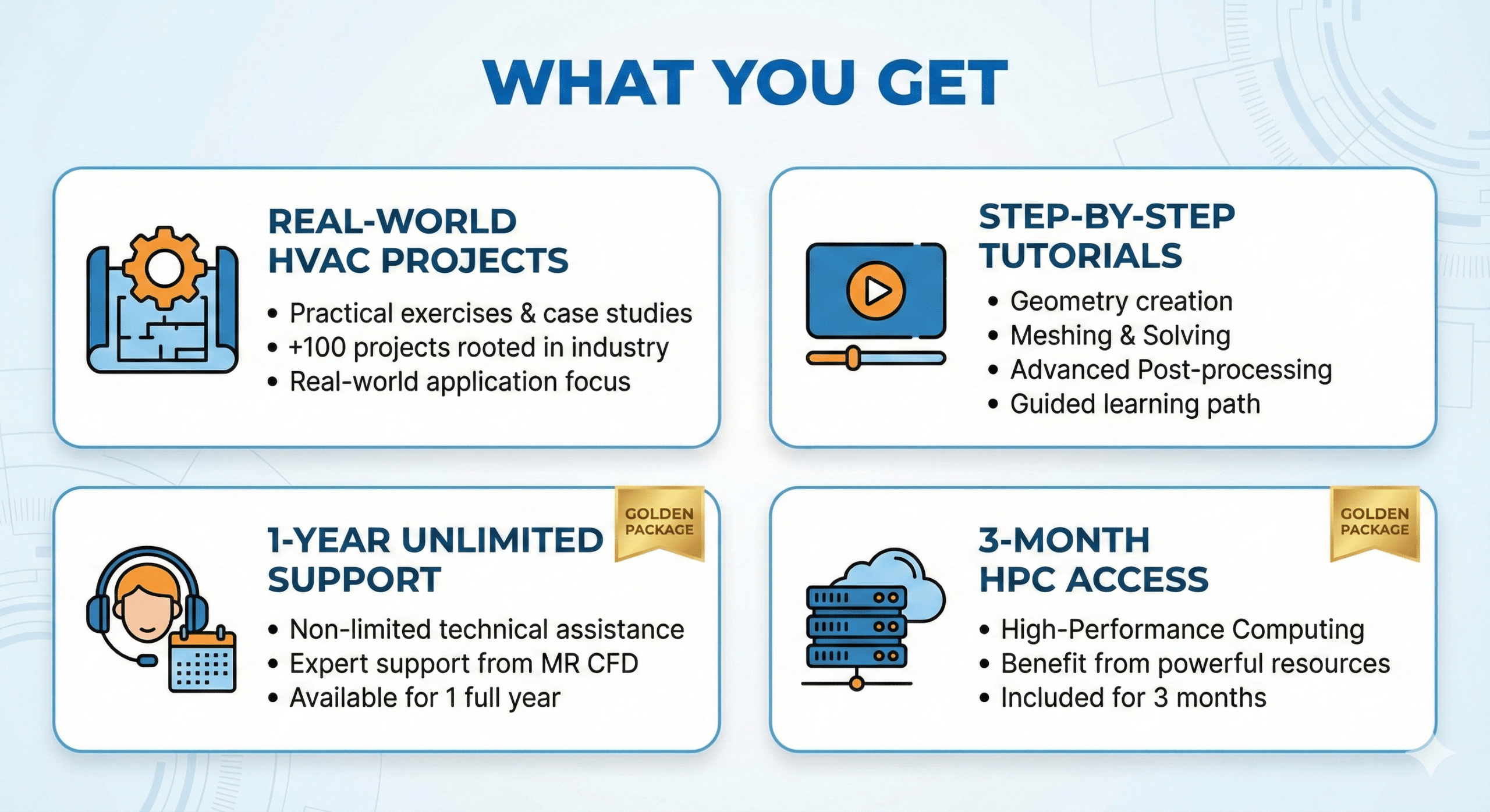 Invest in MR CFD’s “HVAC Engineering CFD Simulation Golden Training Package” and transform your team into HVAC simulation experts ready to meet today’s and tomorrow’s engineering challenges. This turnkey solution empowers your organization to innovate faster, reduce risk, and secure a competitive edge with confidence.