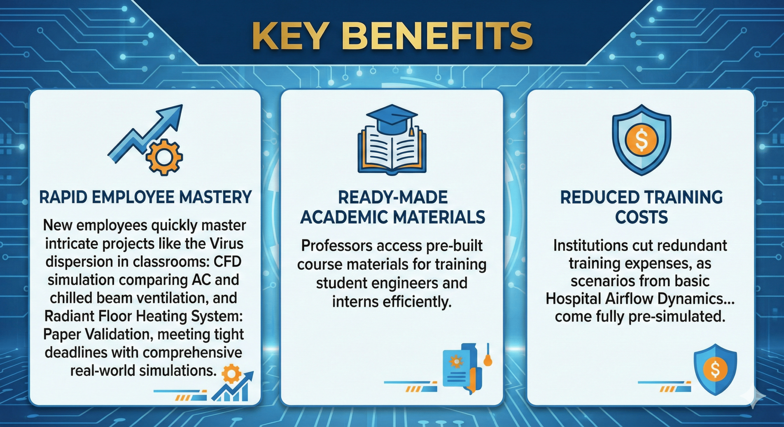 New employees quickly master intricate projects like the Virus dispersion in classrooms: CFD simulation comparing AC and chilled beam ventilation, and Radiant Floor Heating System: Paper Validation, meeting tight deadlines with comprehensive real-world simulations. Professors access pre-built course materials for training student engineers and interns efficiently. Institutions cut redundant training expenses, as scenarios from basic Hospital Airflow Dynamics: A CFD Study on Ventilation Efficiency and Pathogen Dispersion, to Radiator Thermal Performance with Fans: Paper Validation, come fully pre-simulated.