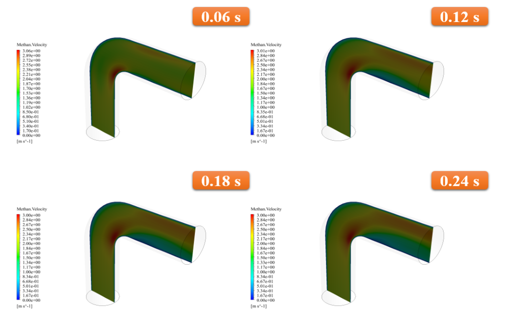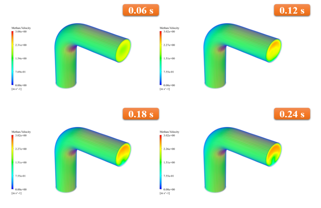 The inlet stream enters the elbow in the form of a mixture of water vapor and methane at a speed of 2 m/s and a temperature of 315 K; So, the inlet flow consists of 80% methane and 20% water vapor.