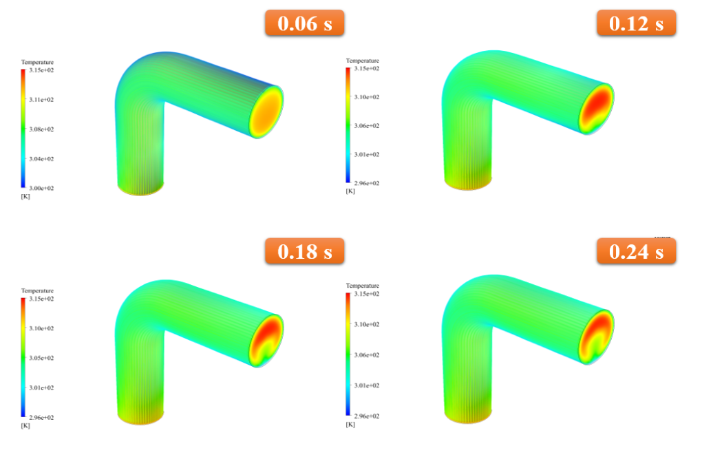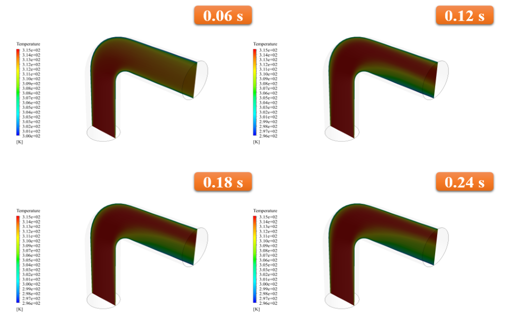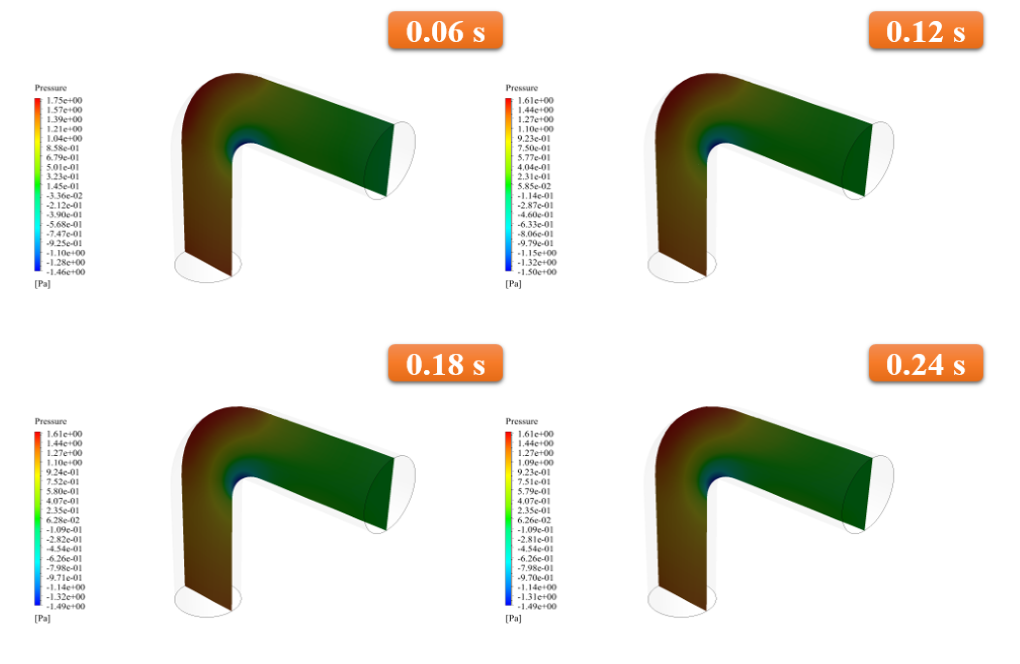 Also, as seen in velocity and pressure contour, the wake region becomes noticeable after the flow passes over the 90-degree bend. Moreover, secondary flows are formed at the outlet boundary due to the fluid flow passing inside a 90-degree pipe.