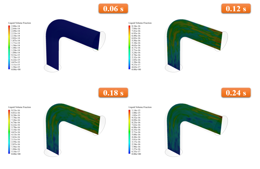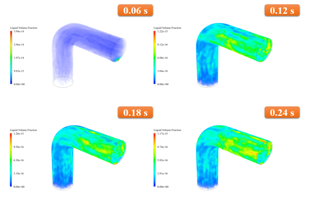 As can be seen from the pictures, as the simulation process progresses, the volume fraction of liquid water produced increases, indicating that the condensation process is taking place.