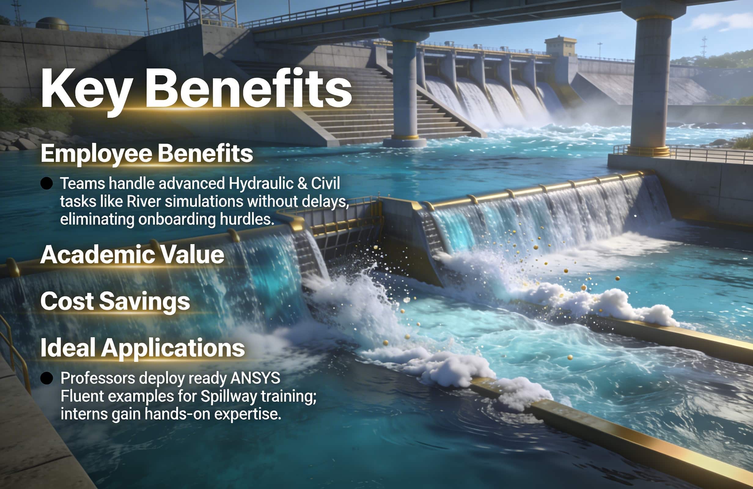 Professors deploy ready simulations as teaching tools, enriching curricula with practical ANSYS Fluent examples for Spillway and beyond. Interns gain hands-on expertise through structured, deployable content.