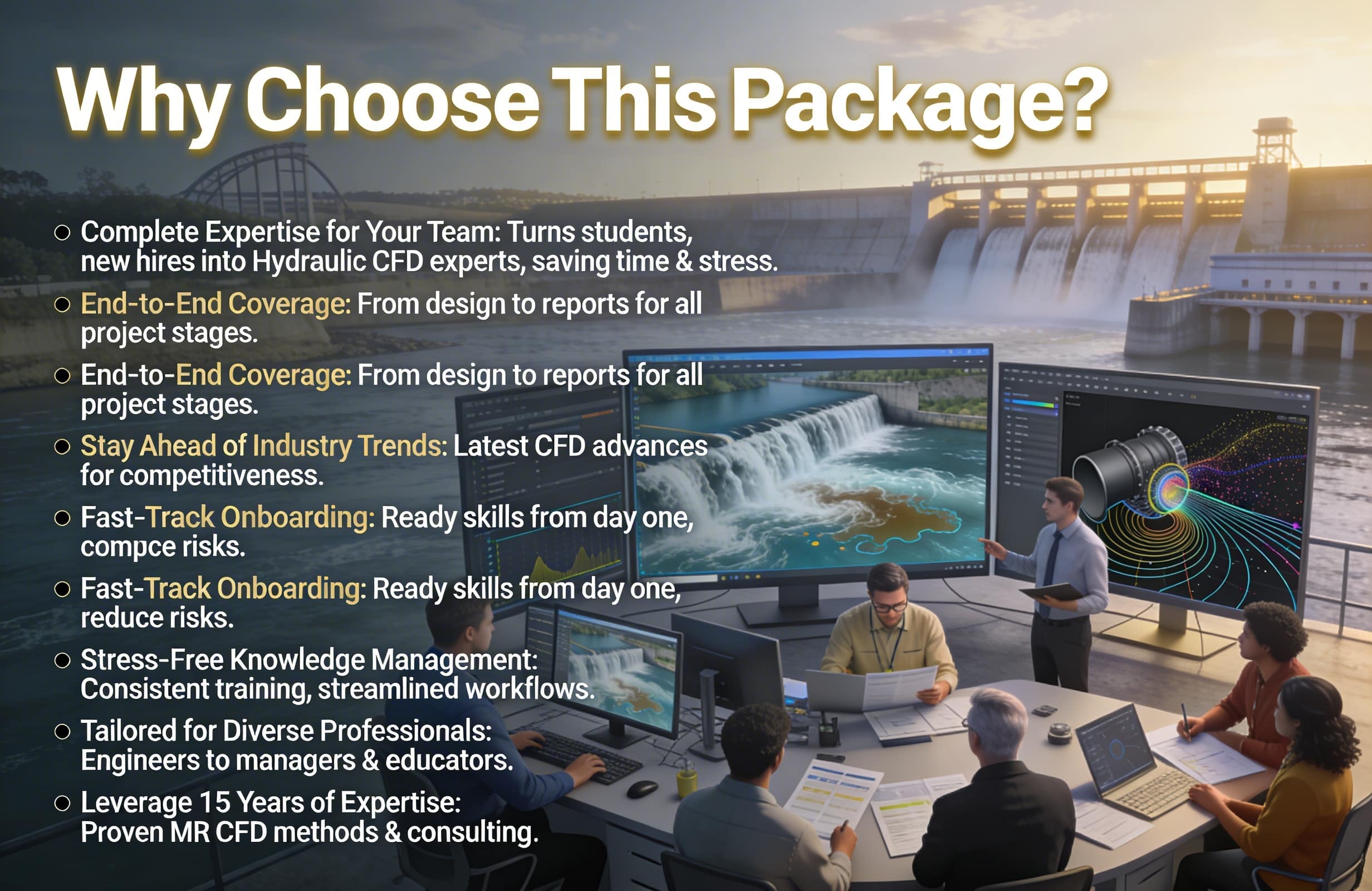 Complete Expertise for Your Team: Whether you have students, new employees, or an experienced team, our package ensures every individual becomes an expert in Hydraulic Structure & Civil engineering CFD simulation projects. No need for additional training, saving you valuable time and reducing stress.