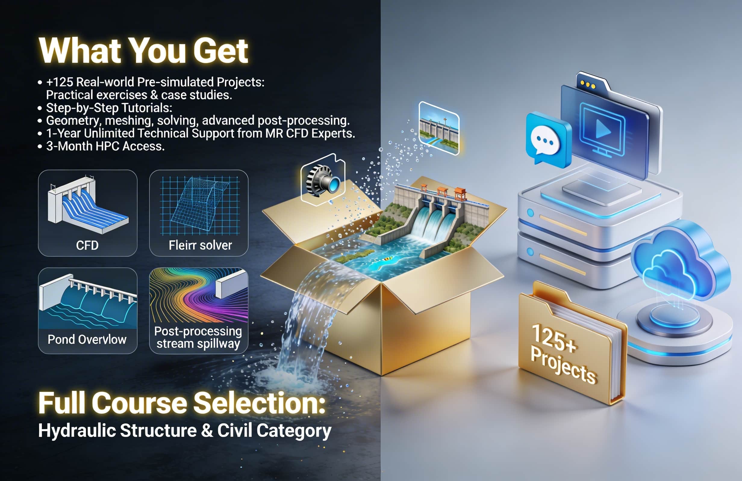MR CFD’s Hydraulic Structure & Civil Engineering Golden Training Package offers over 125 pre-simulated ANSYS Fluent CFD tutorials for beginners to advanced users in hydraulic and civil engineering. It covers real-world projects like spillways, turbines, weirs, hydraulic jumps, cavitation, erosion, pumps, rivers, dams, and more, enabling quick team onboarding, academic teaching, and cost savings on training. Backed by 15 years of expertise, it includes step-by-step videos, geometry/mesh files, 1-year technical support, and 3-month HPC access.