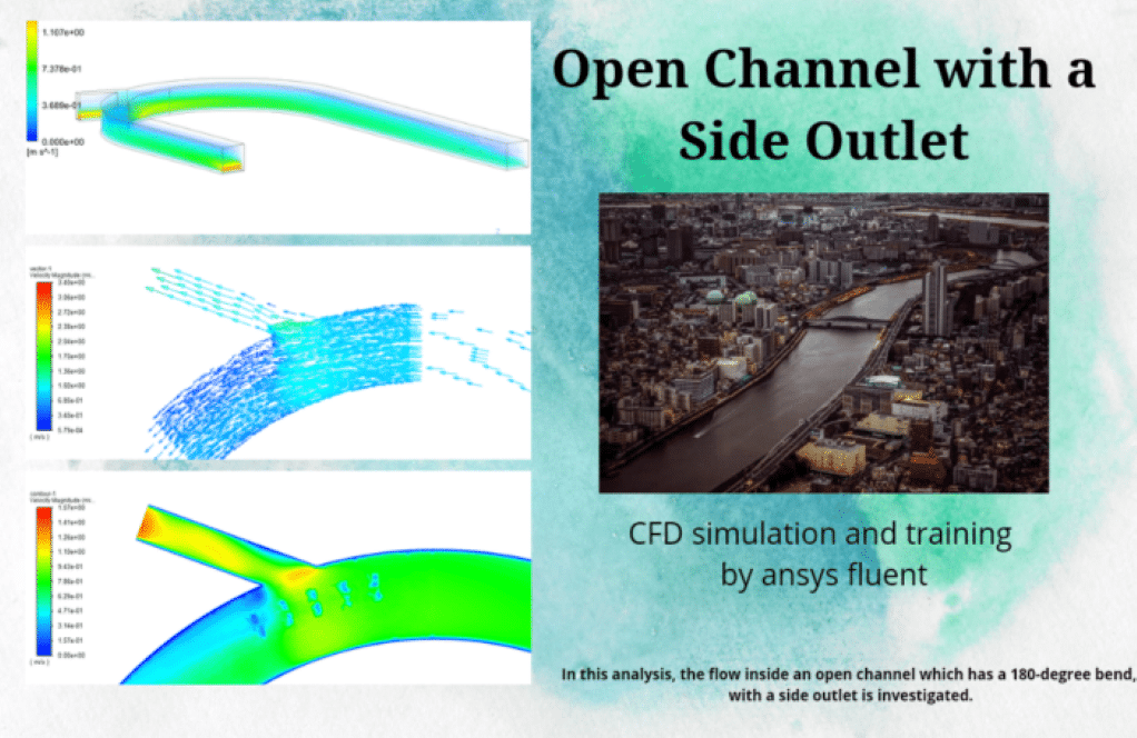 finally, in analysis number 10, the flow inside an open channel which has a 180-degree bend, with a side outlet is investigated. The standard k-epsilon model is used for solving turbulent flow equations. Also, a multi-phase VOF model is activated to simulate two phases of water and air inside the canal.