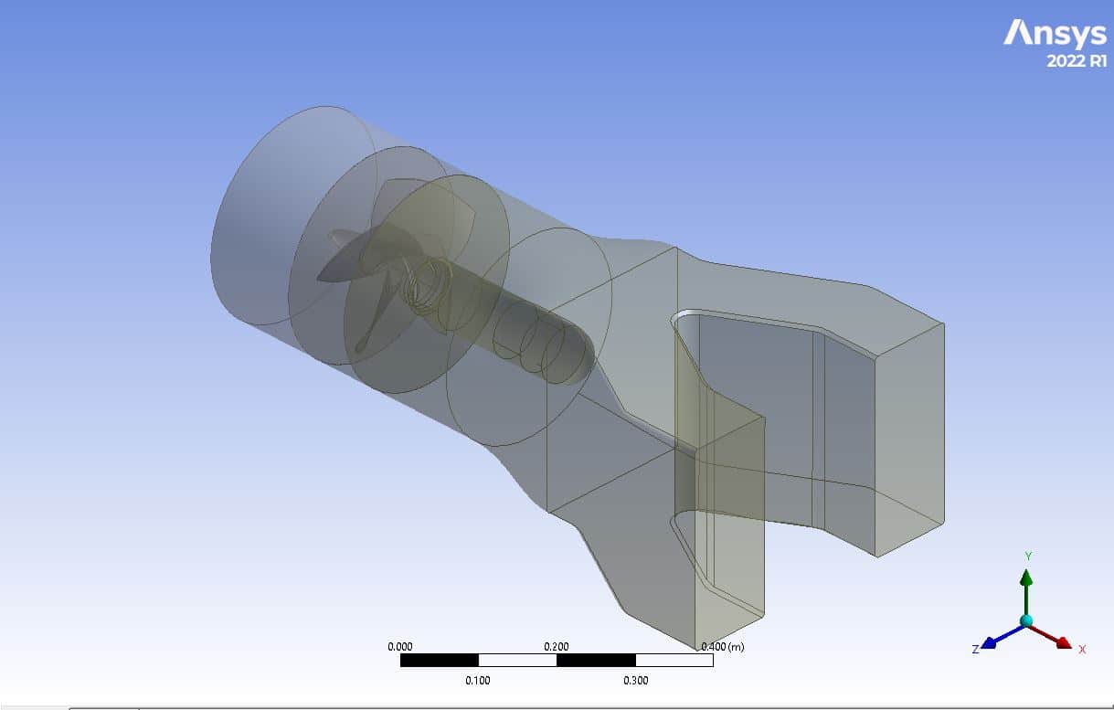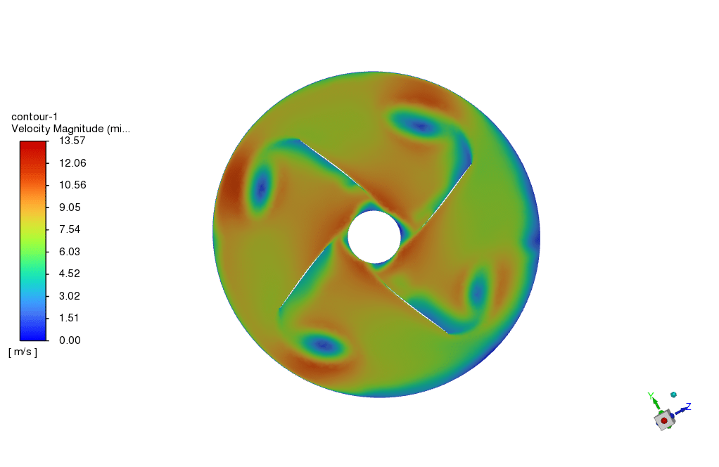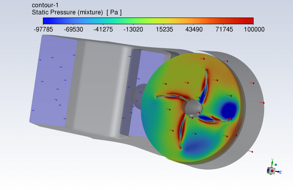 At the conclusion of the solution process, contours in both two and three dimensions are obtained that relate to pressure, velocity, path lines, and velocity vectors. The highest velocity occurs in close proximity to the blades in rotation. Additionally, all potential outcomes can be extracted, such as the pressure drop equaling 2.9811e+4.