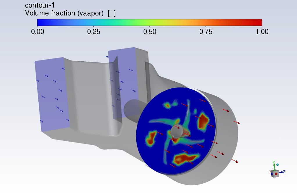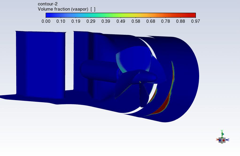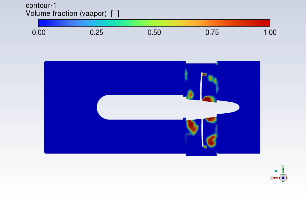 Cavitation is a phenomenon in which the static pressure of a liquid drops below the vapor pressure of the liquid, leading to the formation of small voids filled with vapor in the liquid. Vapor volume fraction Contours show where the cavitation happened.