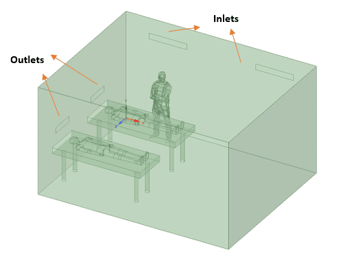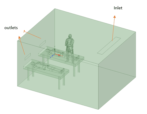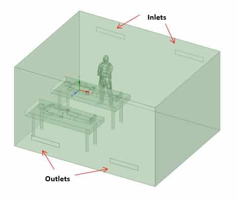 In the first step, the ICU is simulated with its initial condition considering the widely used HVAC systems which assume inlets and outlets on opposite walls(check Figure below). The inlet velocity is 0.58m/s and 294K temperature while virus aerosols are injected with patient 1 breath.