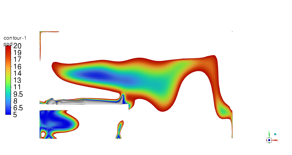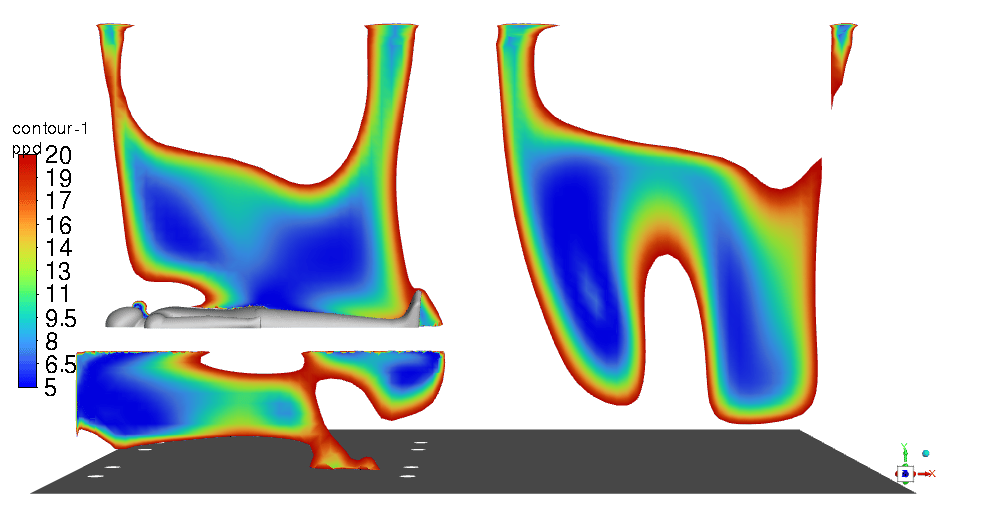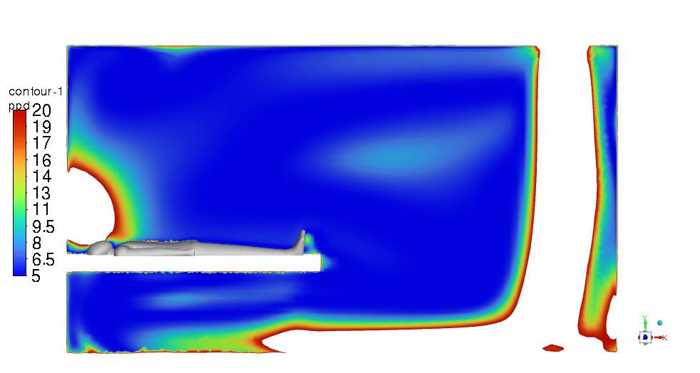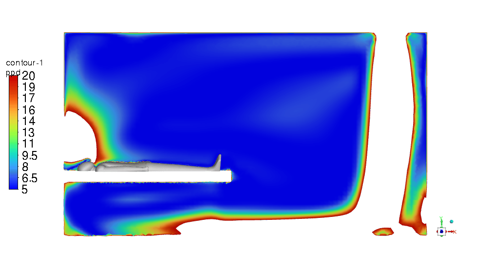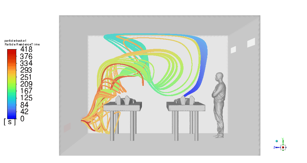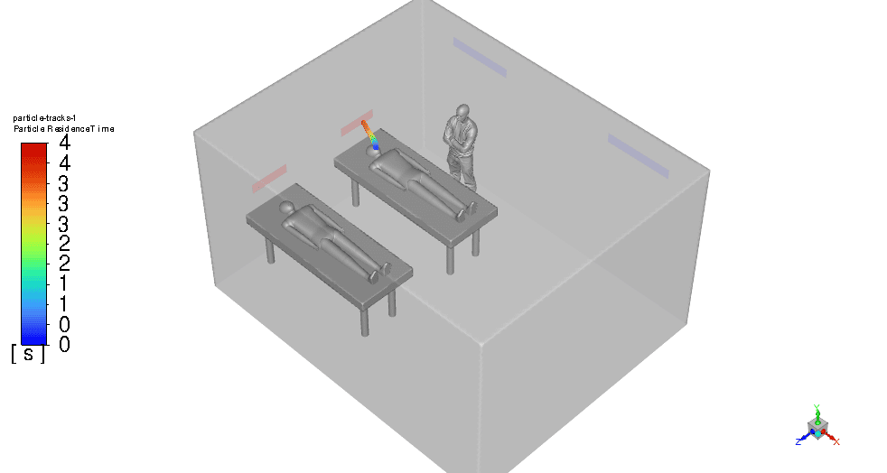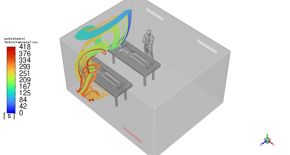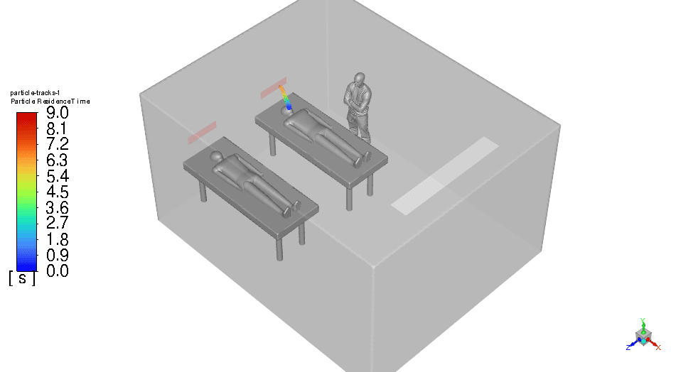 To measure the aerosol particles’ residence time accurately in the simulation, particle tracking techniques are used within the CFD software. The simulations track the movement and concentration of aerosol particles emitted from patient #1’s breath over time. By defining particle release parameters that replicate a cough or a sneeze and setting up transient simulations, the software can track the time these particles take to be removed from the ICU room through the ventilation system. The modeling accounted for various factors such as airflow patterns, particle size, and room configurations to ensure realistic and accurate results that underpin the effectiveness of the design.