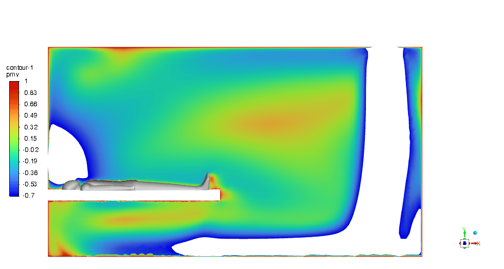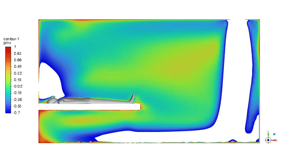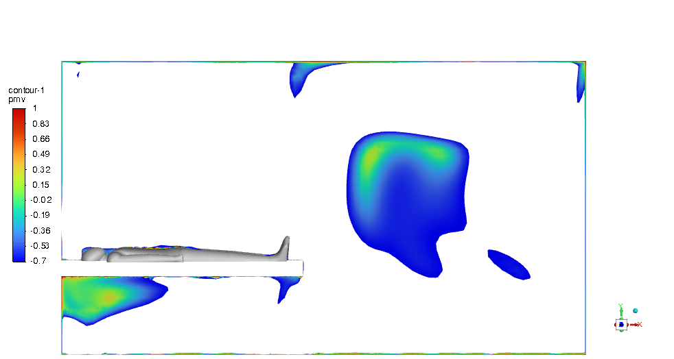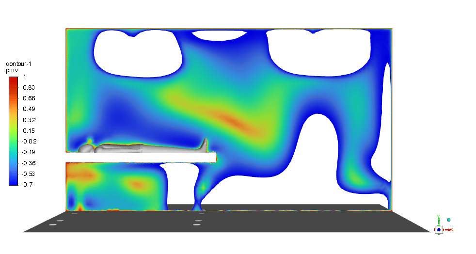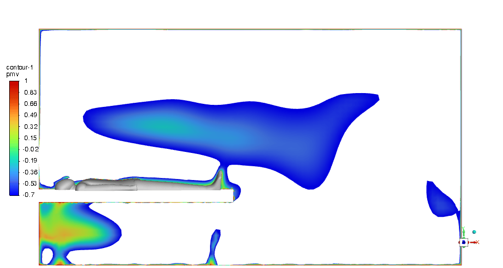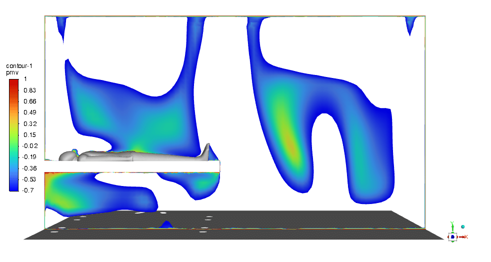 The PMV & PPD contours show that this design can be very promising and we can be assured of thermal comfort in the ICU room. Most of the critical regions in the room are in an acceptable range. You can check them below in Figures 11 & 12.