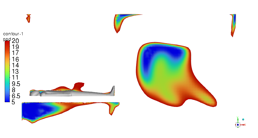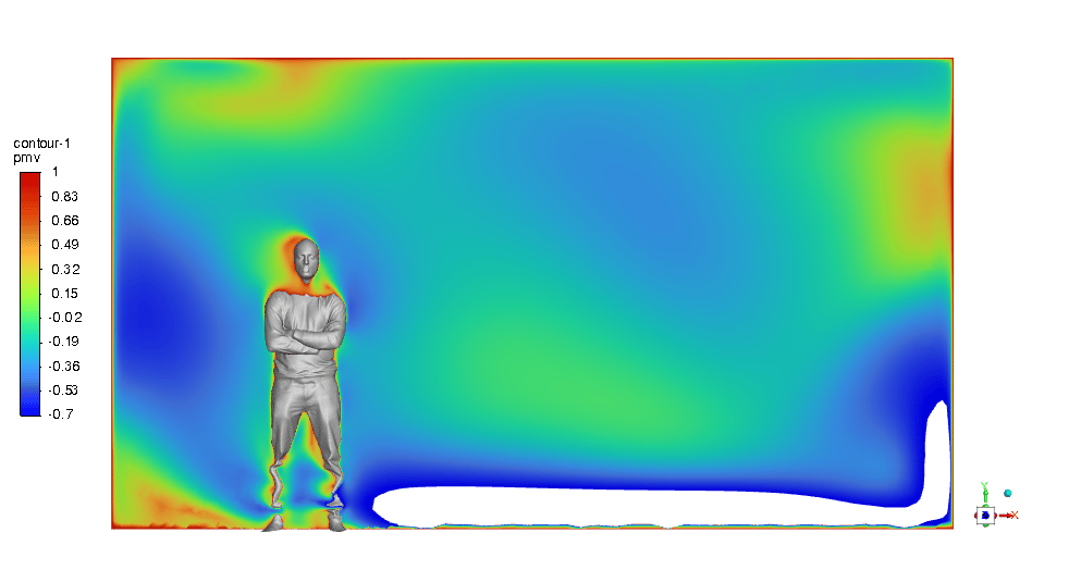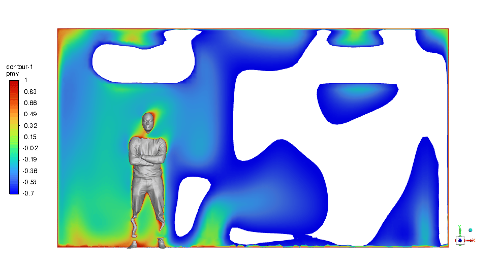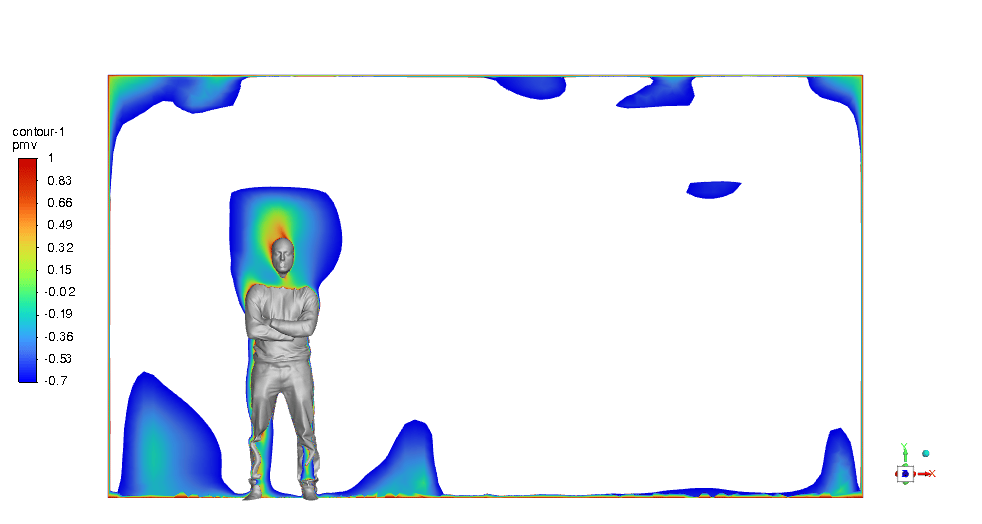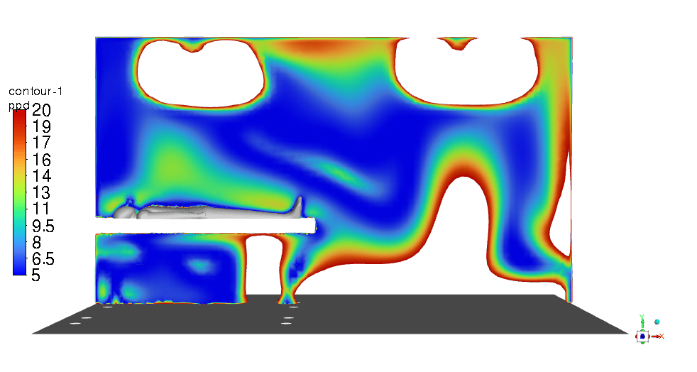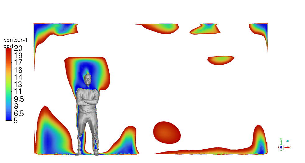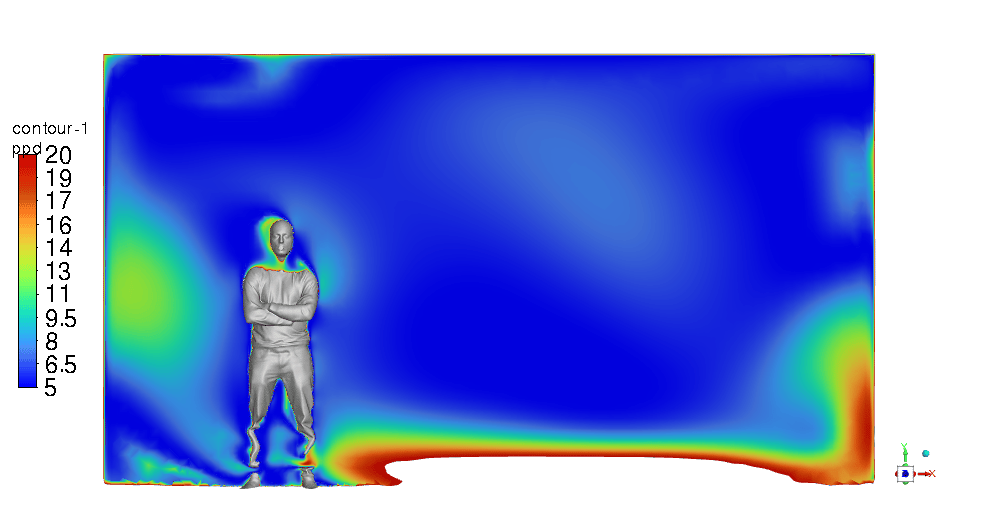 The PMV & PPD contours show that this design can be very promising and we can be assured of thermal comfort in the ICU room. Most of the critical regions in the room are in an acceptable range. You can check them below in Figures 11 & 12.