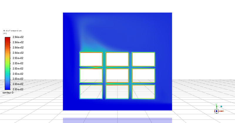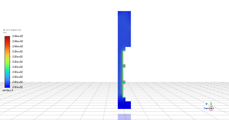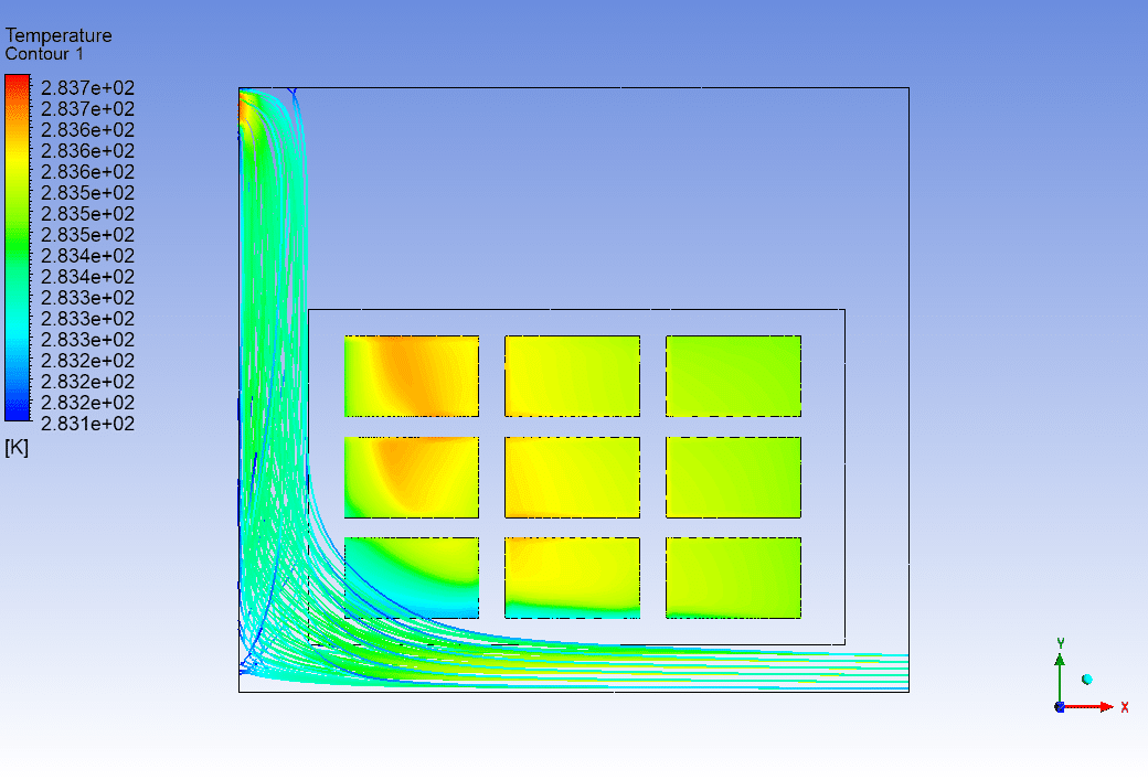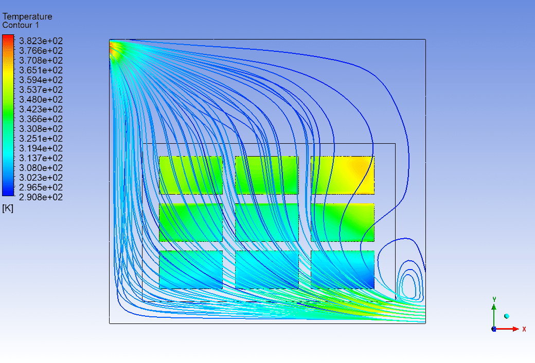After the solution, 2D and 3D contours were displayed. It is worth mentioning that the inlet velocity for air and water is the same (0.1m/s). However, the flow patterns are entirely different. As shown in the attached figures, the air can reach higher parts of the case before leaving through the outlet, resulting in longer contact with hot surfaces. This can be beneficial and all 9 chipsets experience a temperature downfall. However, the water circulation is different, and it cannot make full contact with all 9 chipsets, just the bottom row. Still, the results show that using an immersion cooling system is more efficient. To sum up, the heat sink`s surface average temperature reaches 335.26K, which can cause damage, but considering the immersion system, it results in 283.53K. Remember that the initial temperature of air and water was 283K in both cases.