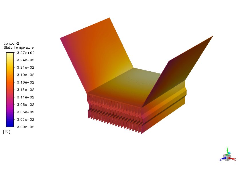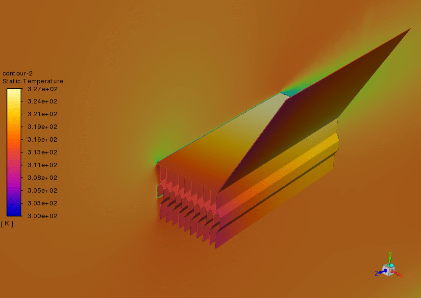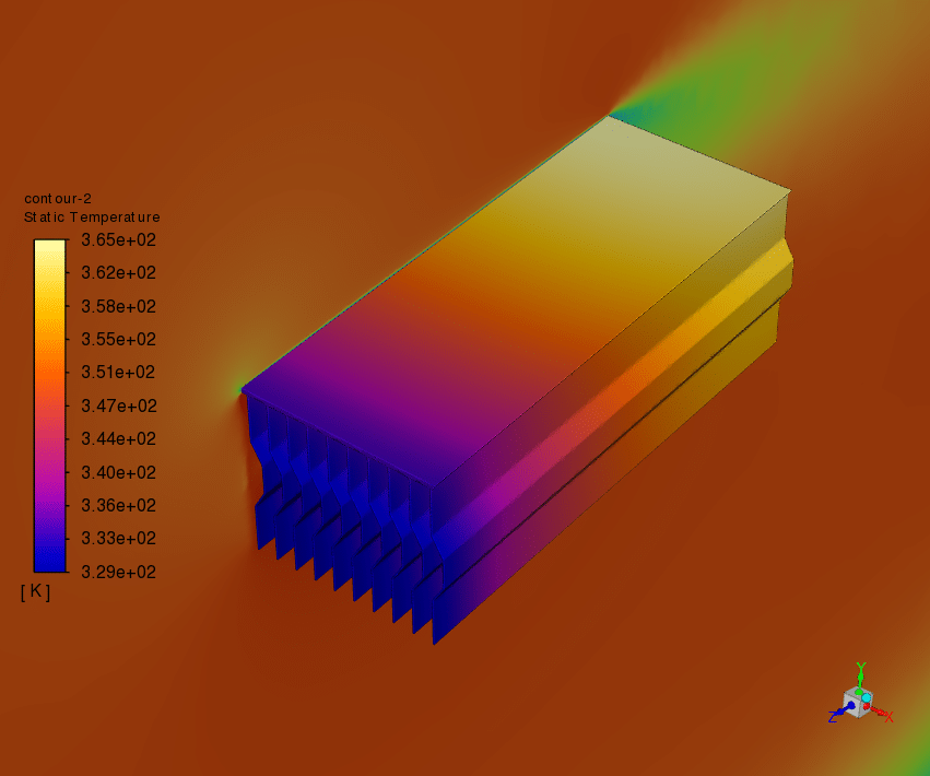 The CFD simulations reveal significant differences in temperature distribution between the two geometries. The open design exhibits a more uniform temperature distribution, with higher temperatures concentrated near the base of the heat sink. This suggests that the exposed fins facilitate heat dissipation more effectively. Conversely, the enclosed design shows greater temperature variation, with higher temperatures concentrated within the enclosed space. This indicates that the closed top restricts heat transfer and reduces the cooling efficiency.
