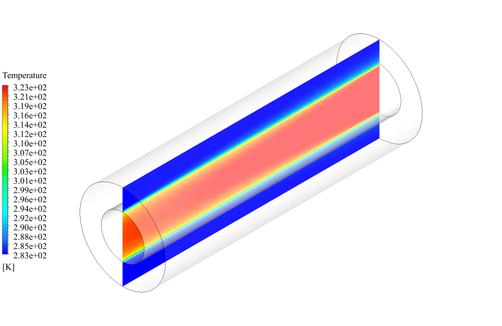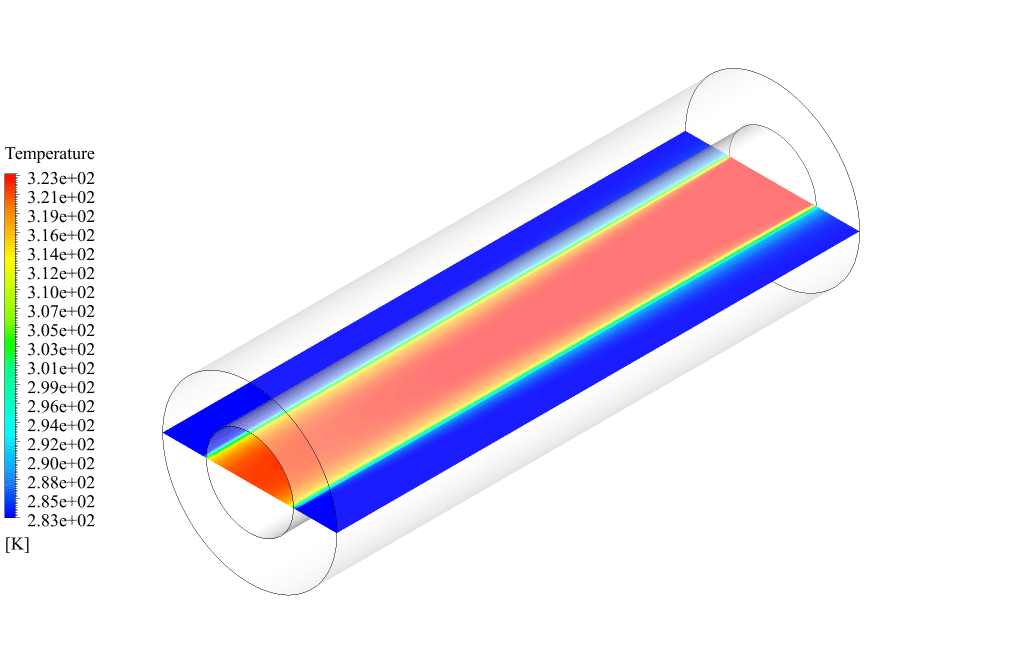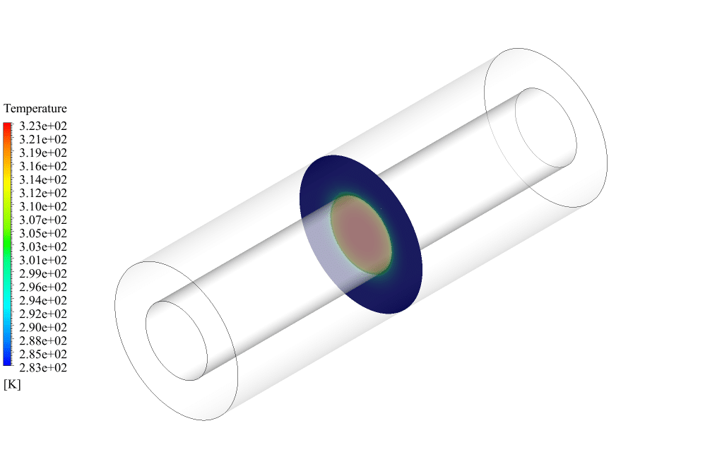 After ensuring the UDF works correctly, we start the final solution process. Then, we examine the temperature contours. The results show that the heat transfer occurs correctly inside the heat exchanger.
